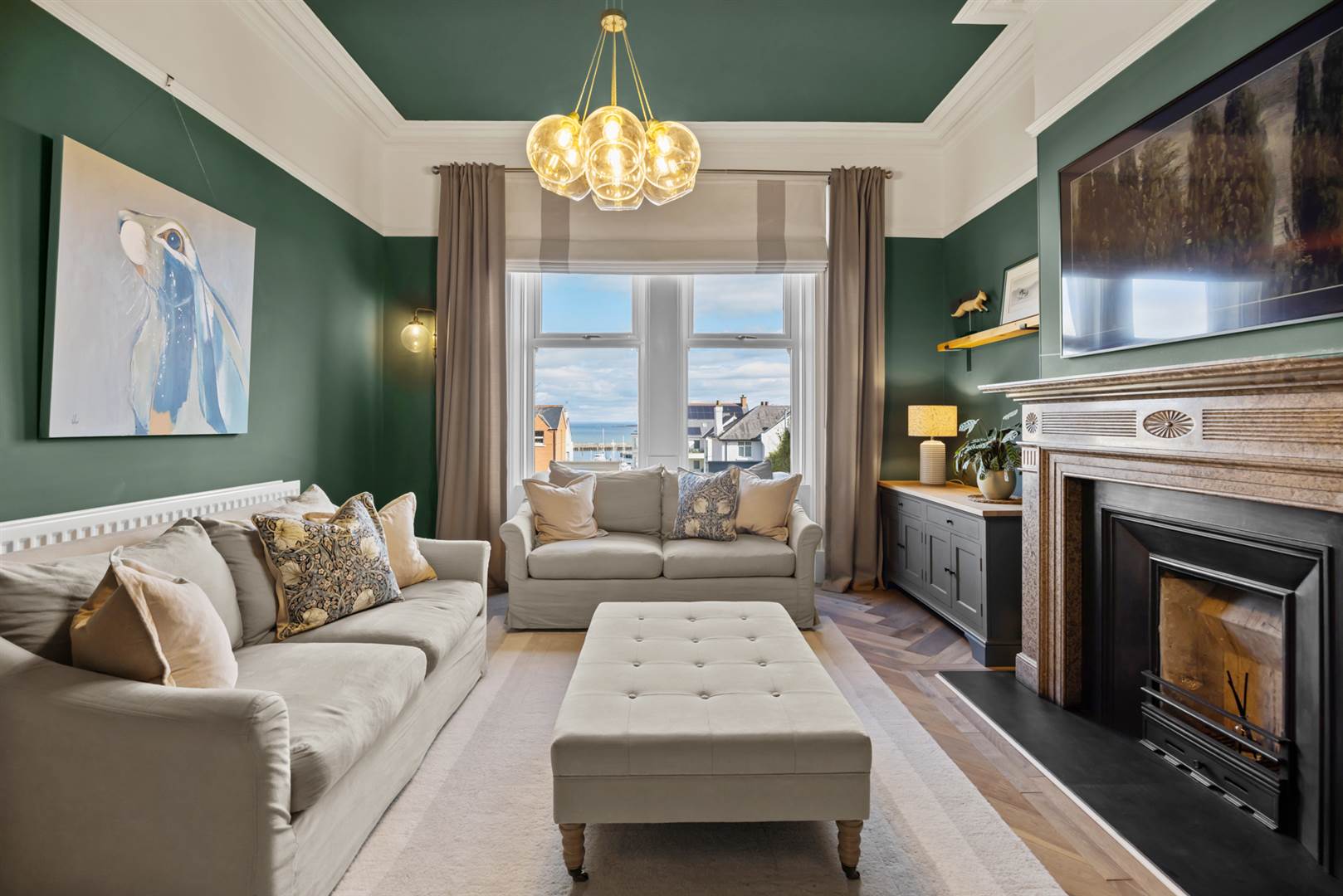 Fireplace with marble surround, cast iron horseshoe inset, slate hearth, wall lighting, limed oak herringbone floor, cornice ceiling, picture rail, feature panelled bay window with views over Bangor Marina, the Irish Sea and Scotland on a good day.