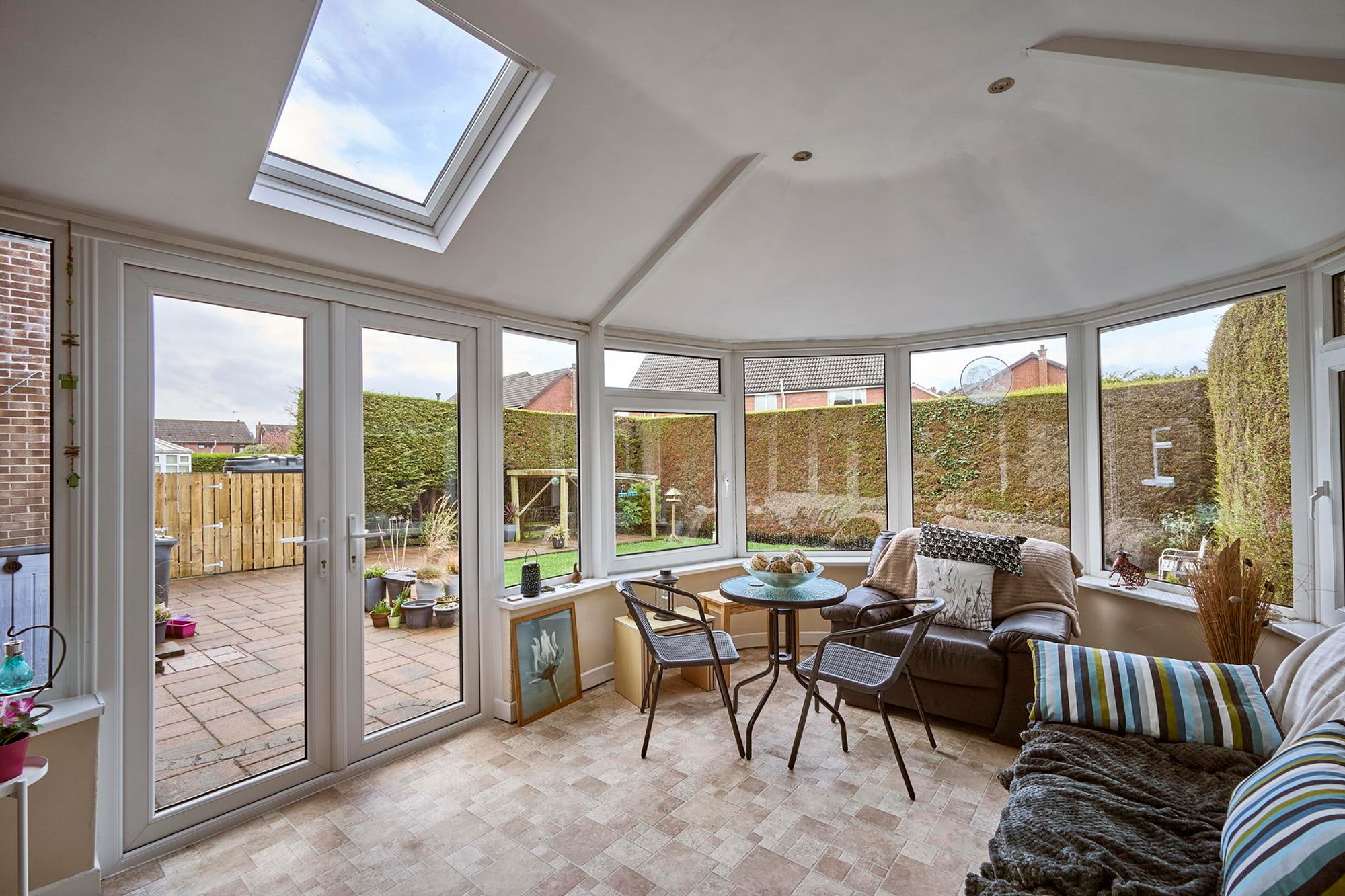 Generous sunroom accessing the enclosed south facing rear garden.