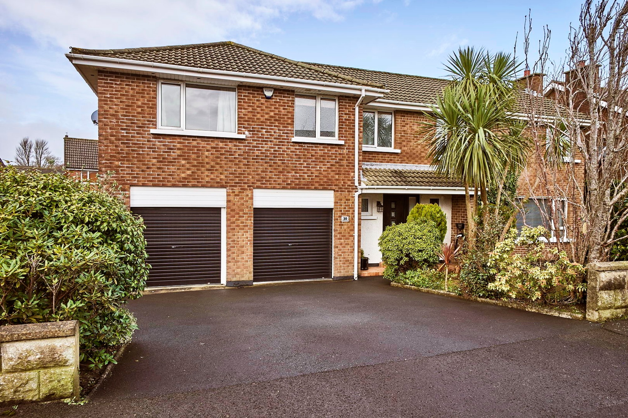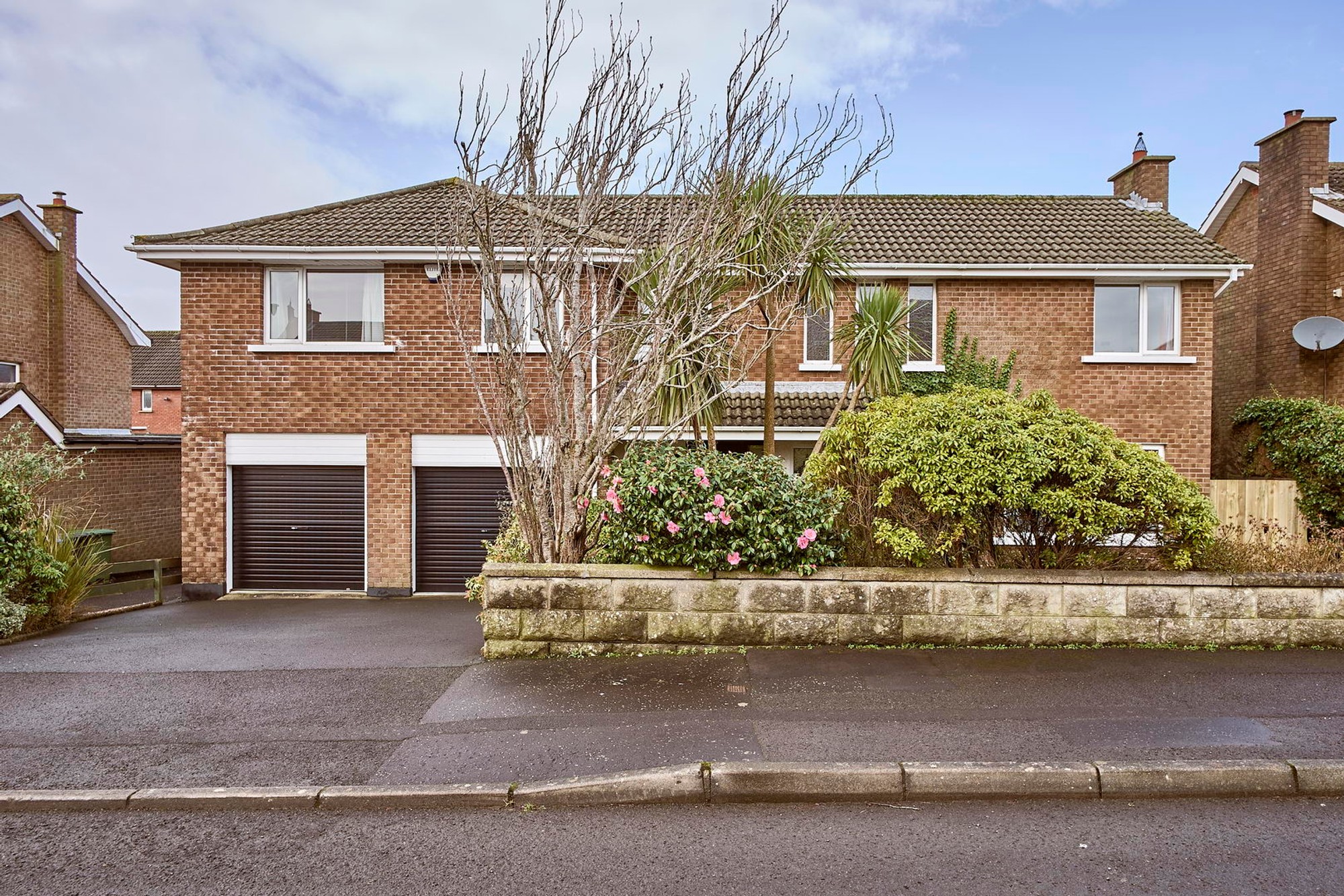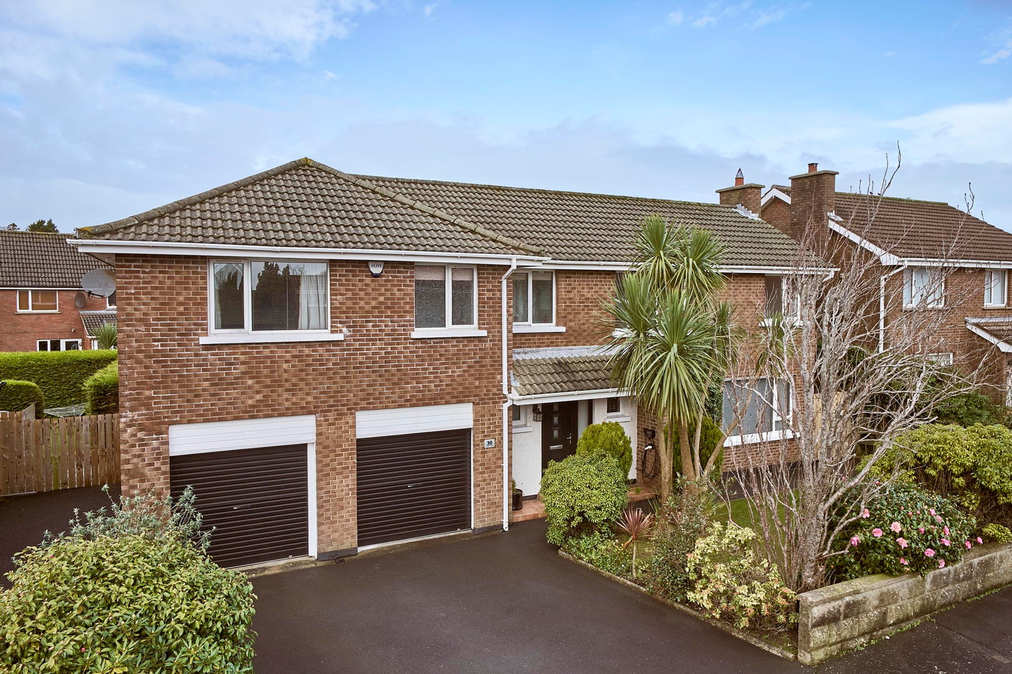 The front is in manicured lawns including small hedging and shrubs with a multi car driveway.