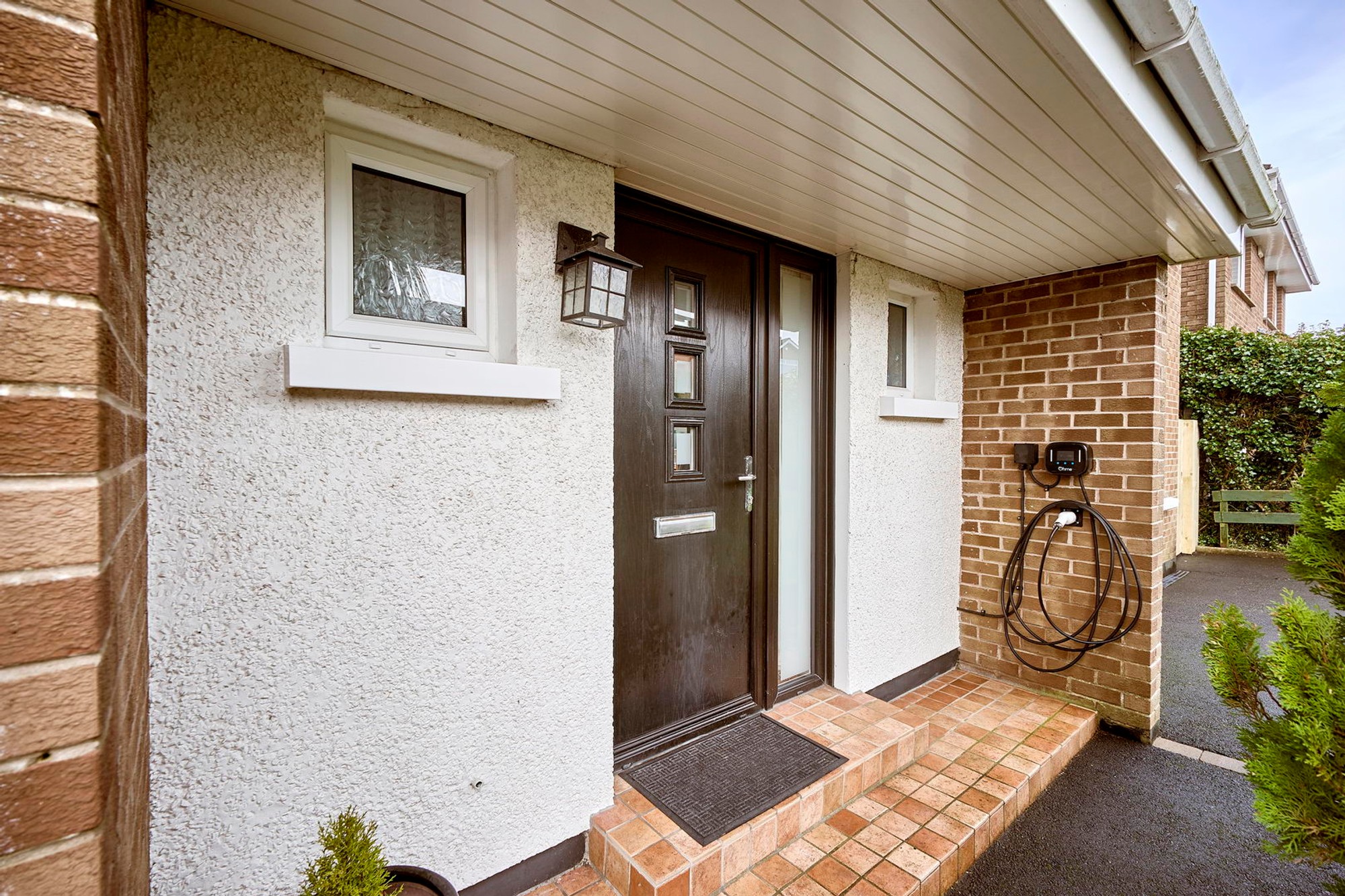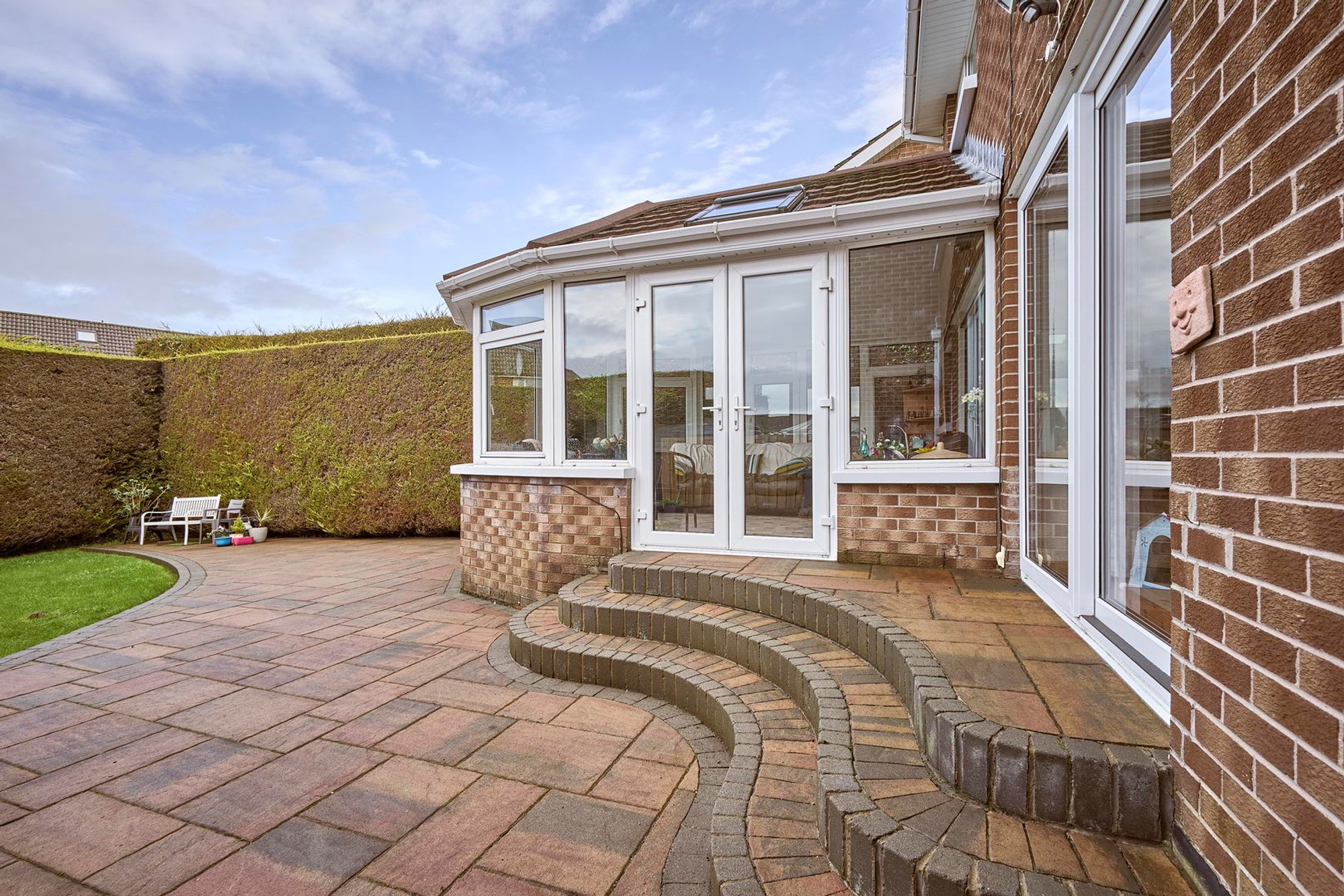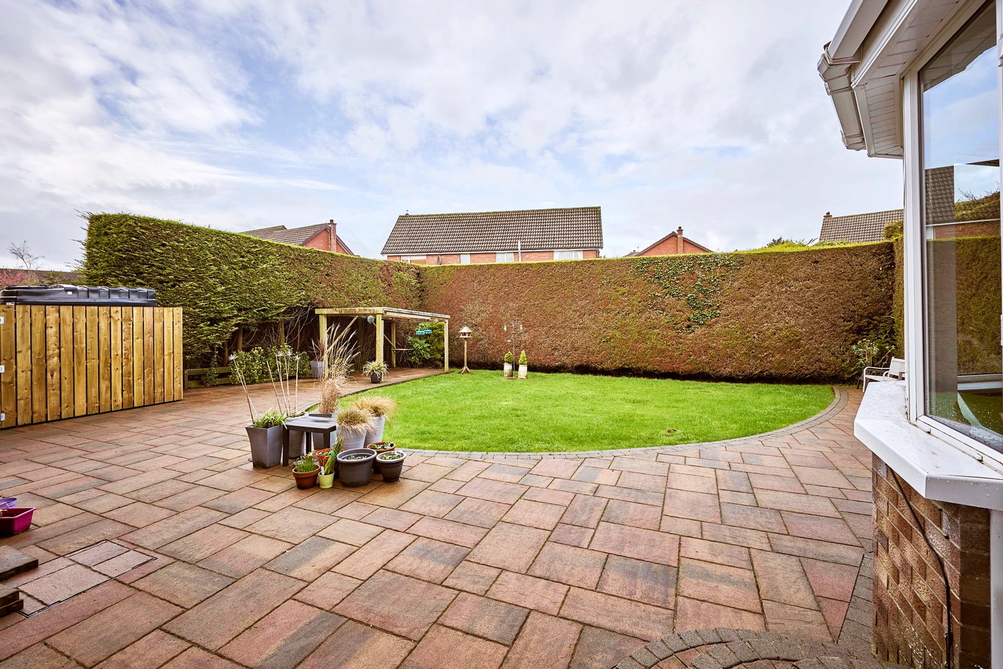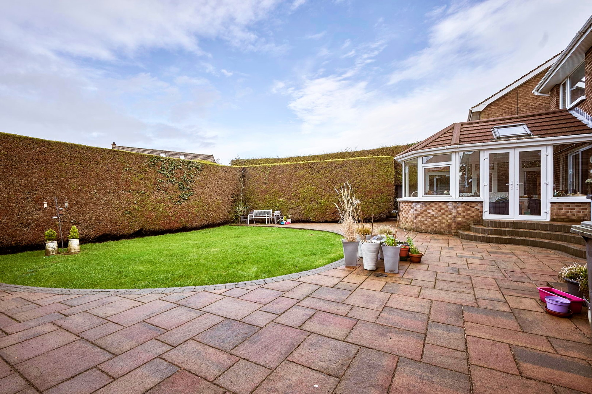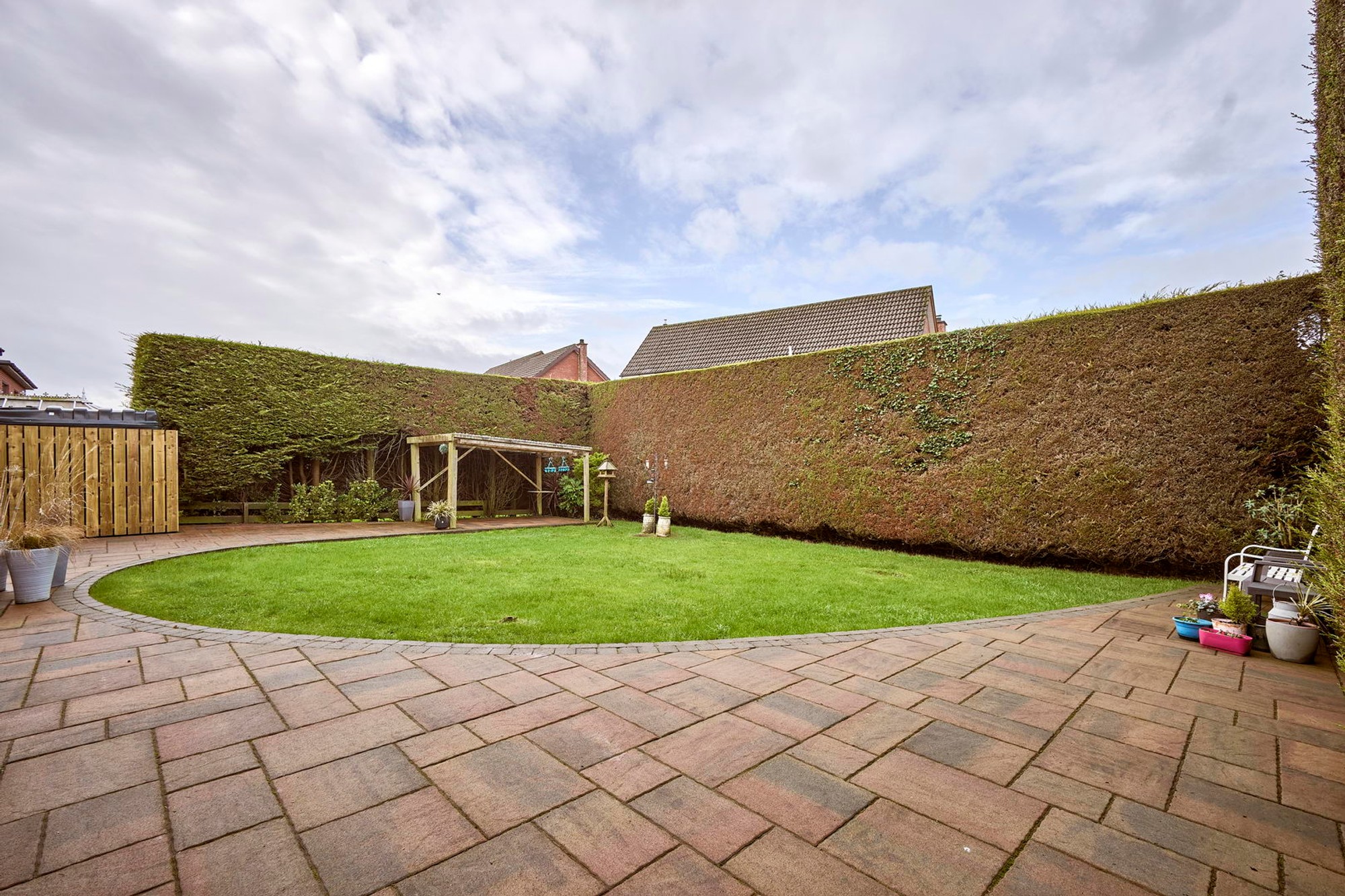 Generous enclosed south facing rear with a range of manicured lawns and hedging, substantial decorative paving and covered drying area.