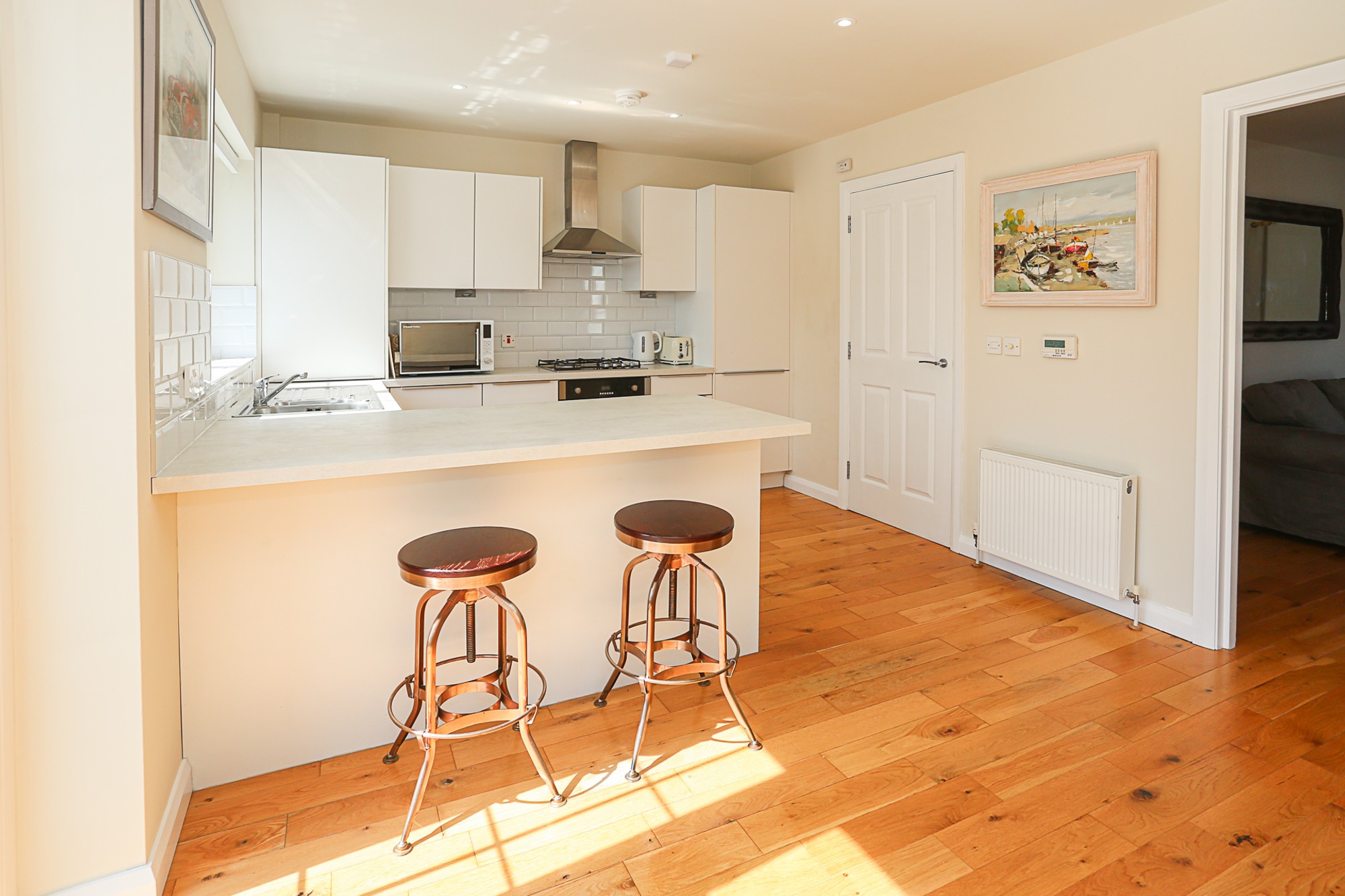 The accommodation is well laid out over two floors. The ground floor features a spacious lounge with a charming wood-burning stove, leading to a contemporary, fully fitted kitchen with ample dining space. A convenient cloakroom with WC and wash hand basin is located under the stairs.