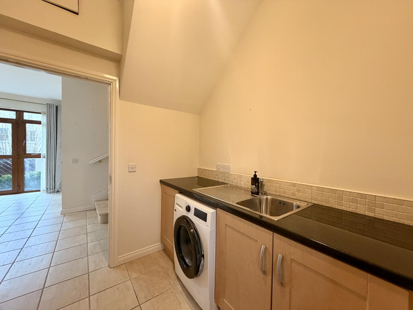 The accommodation comprises a bright lounge with dual aspect outlook, open through to a modern fitted kitchen with an excellent range of maple units, integrated appliances, and pleasant views over the patio garden. A separate utility room provides additional storage and includes a WC.