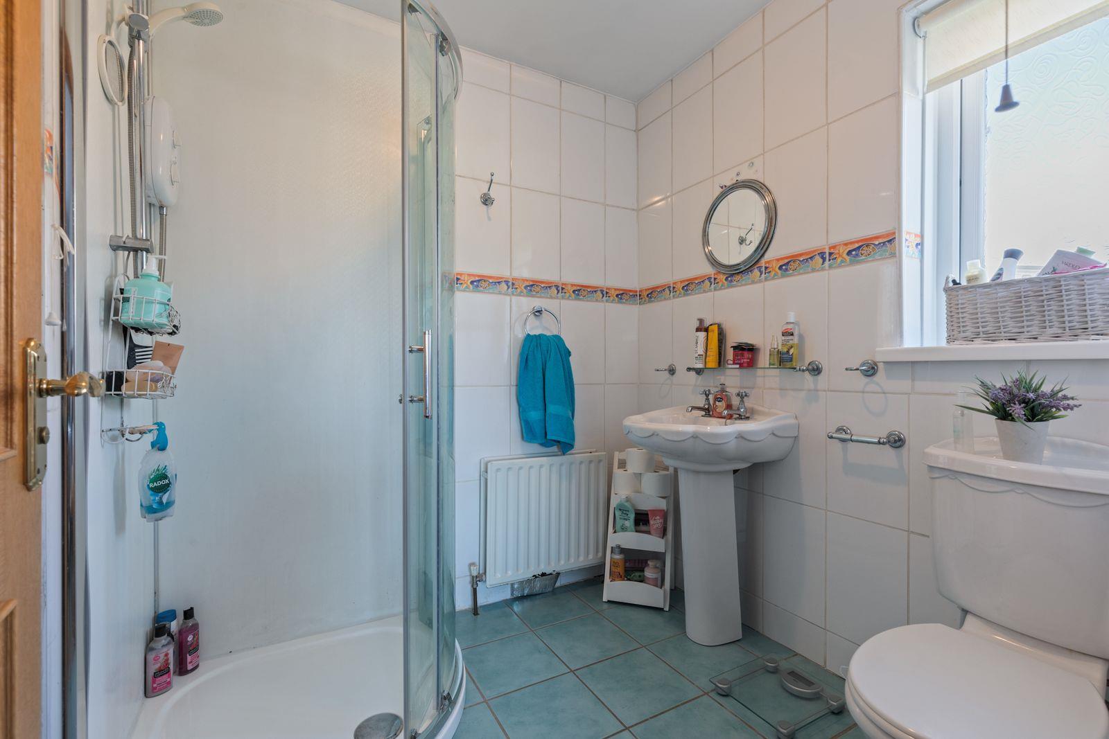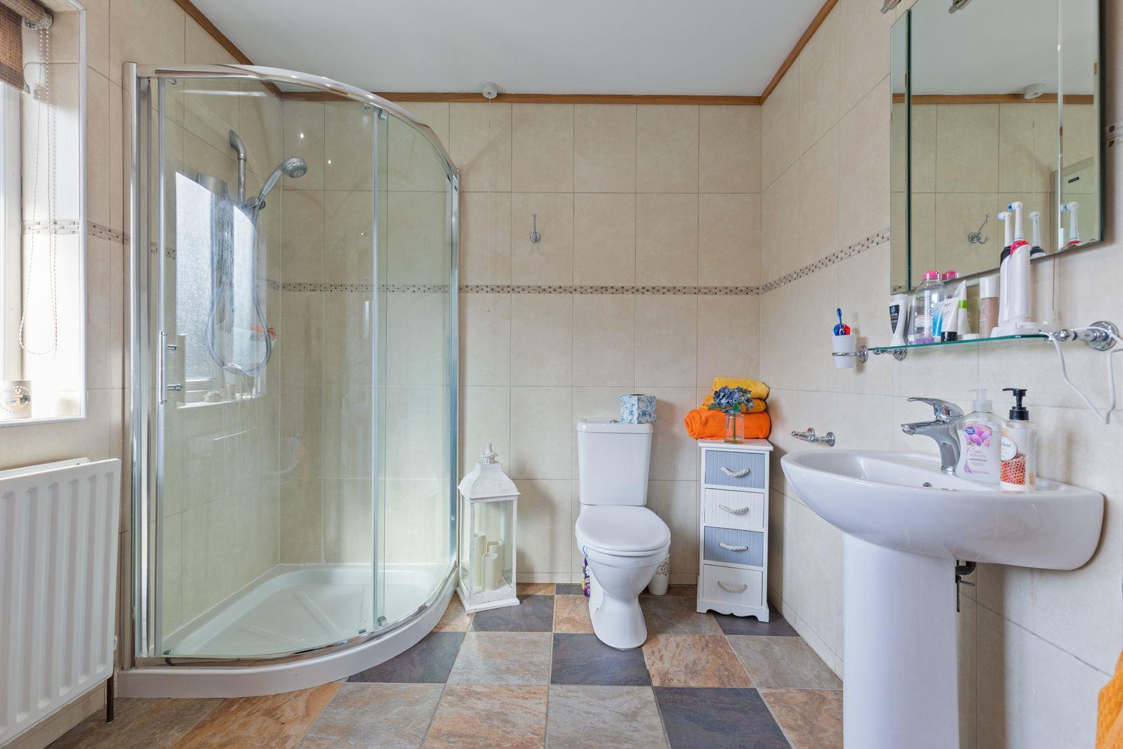 Comprising: Corner shower with Mira electric shower. Pedestal wash hand basin. W.C. Part tiled walls. Ceramic tiled floor. Built-in extractor fan.