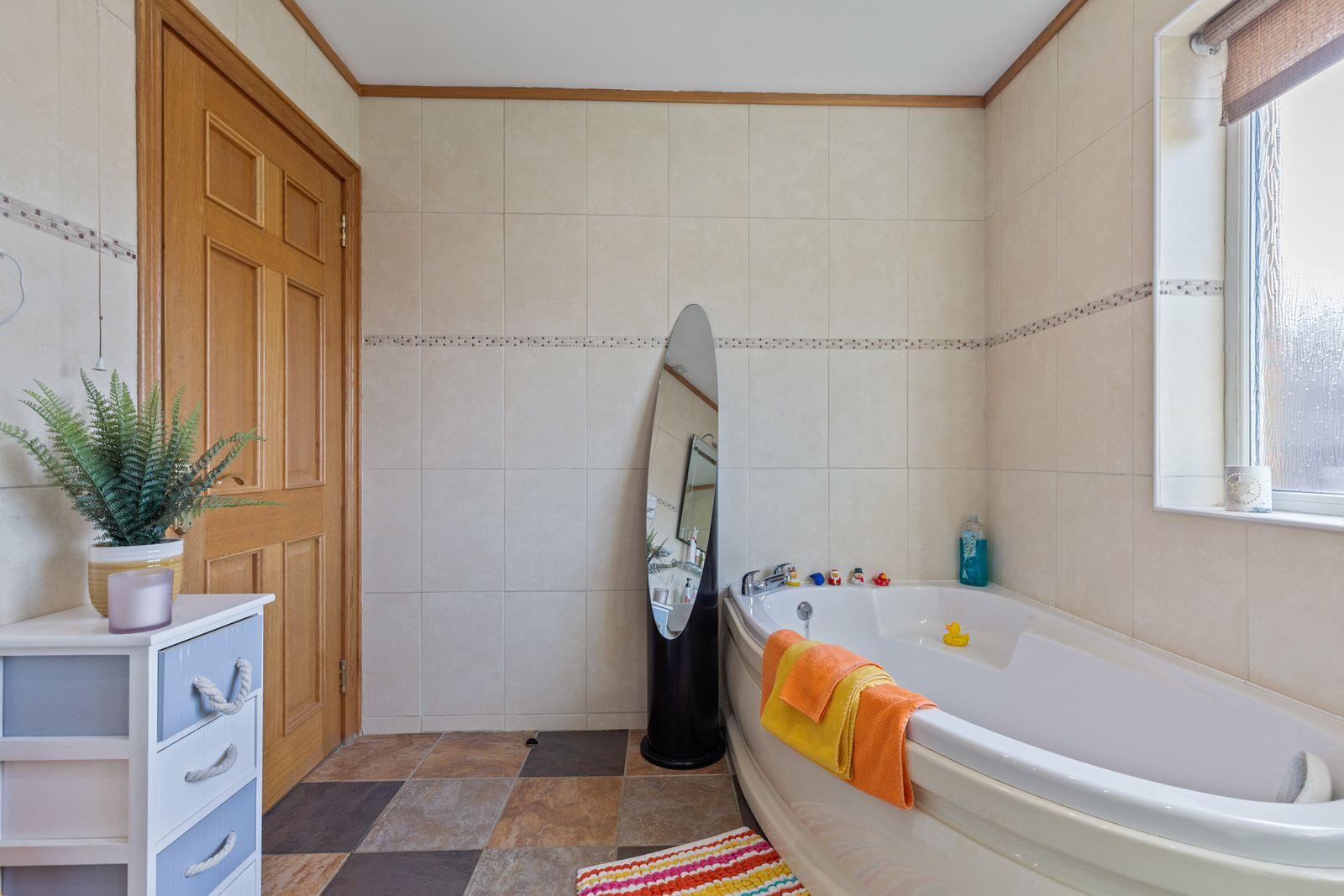 White suite comprising: Corner panelled bath with mixer taps. Corner shower with Aqualisa Aquastream electric shower. Pedestal wash hand basin. W.C. Tiled walls and floor. 4 Downlights. Built-in extractor fan.