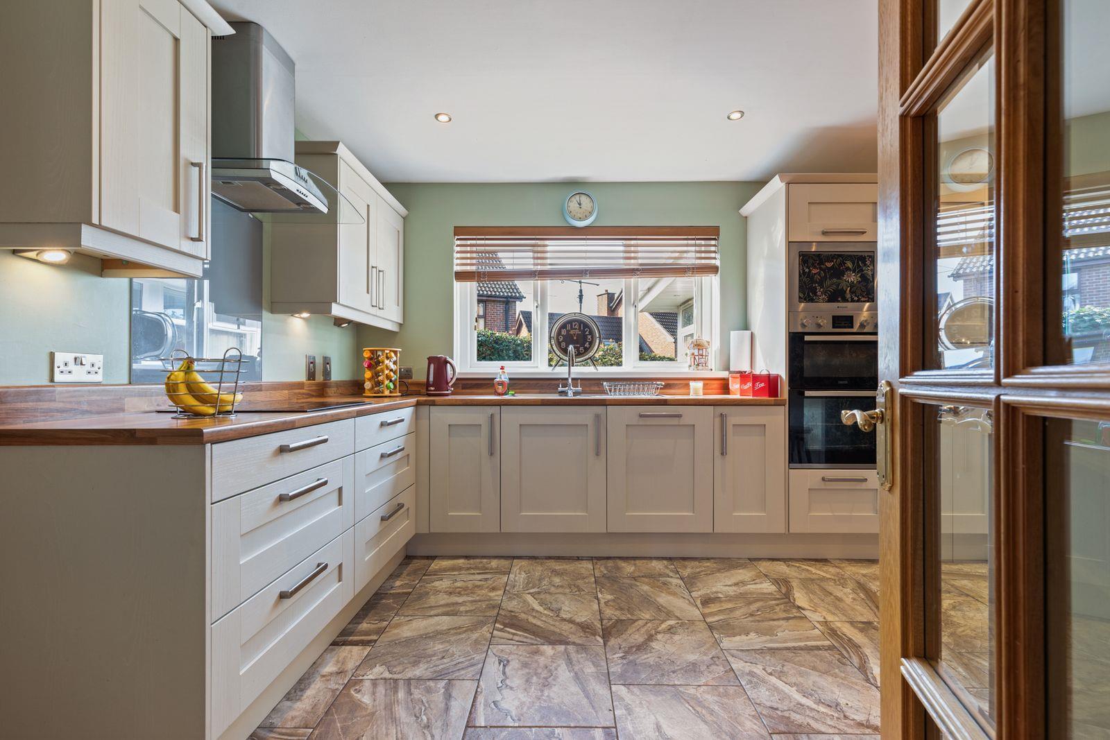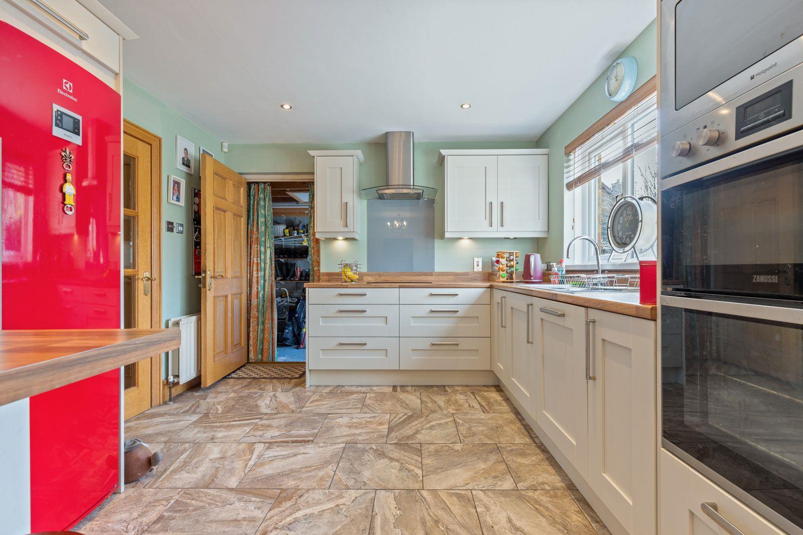 Range of cream high and low level cupboards and drawers with roll edge work surfaces incorporating unit display cabinets. Hotpoint 4 ring hob and double oven. Built-in extractor hood with integrated extractor fan and light. 11/2 tub single drainer stainless steel sink unit with mixer taps. Plumbed for washing machine. Concealed lighting. 6 Downlighters. Ceramic tiled floor.