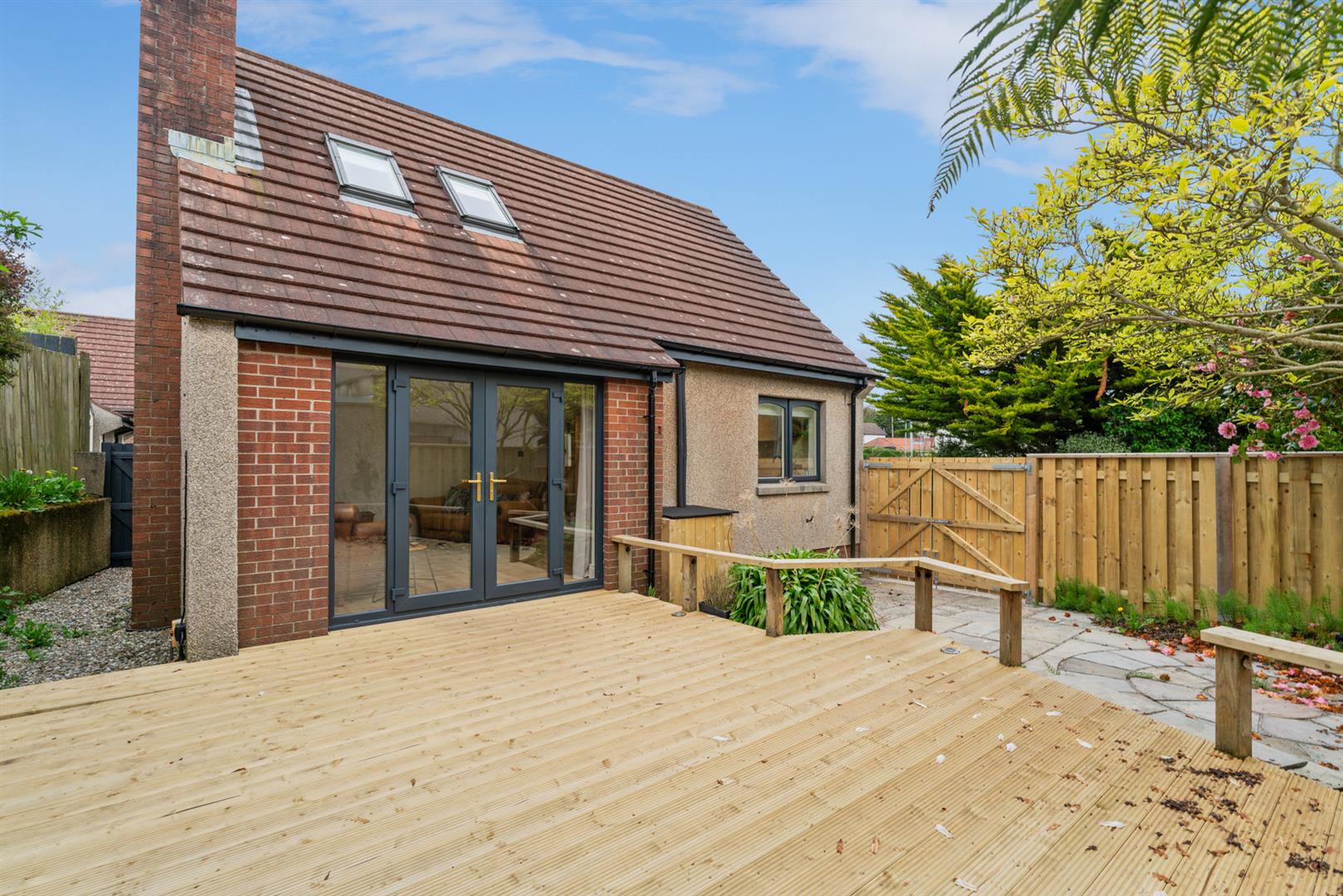 Outside, the landscaped gardens are sure to impress, featuring a raised decked entertaining area ideal for hosting gatherings or simply enjoying a peaceful evening outdoors. The large living room is a standout feature, complete with a multi-fuel stove for cosy nights in and double doors that open up to the rear garden, seamlessly blending indoor and outdoor living.
