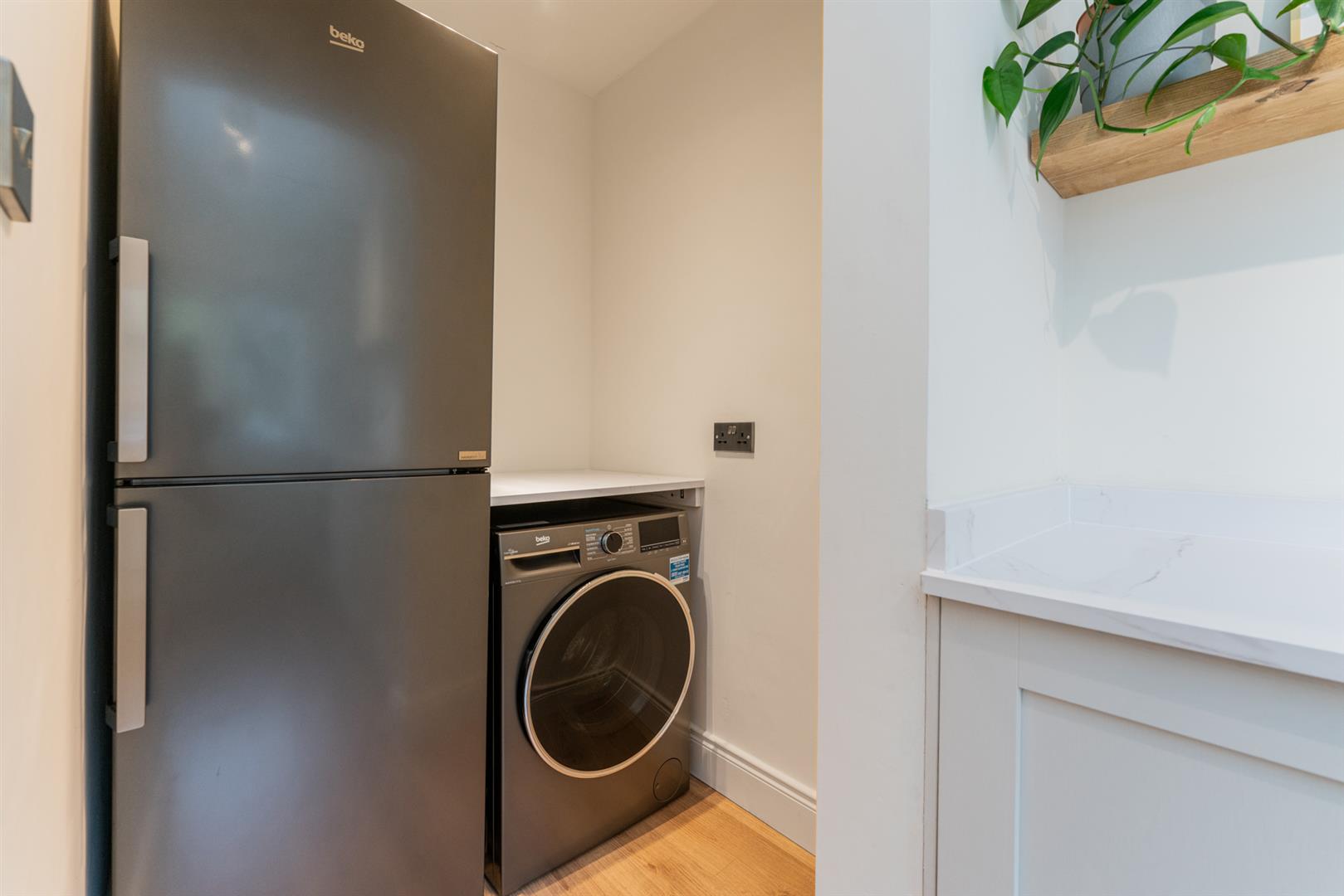 Quartz affect worktop, plumbed for washing machine, space for fridge/ freezer, wood laminate flooring.