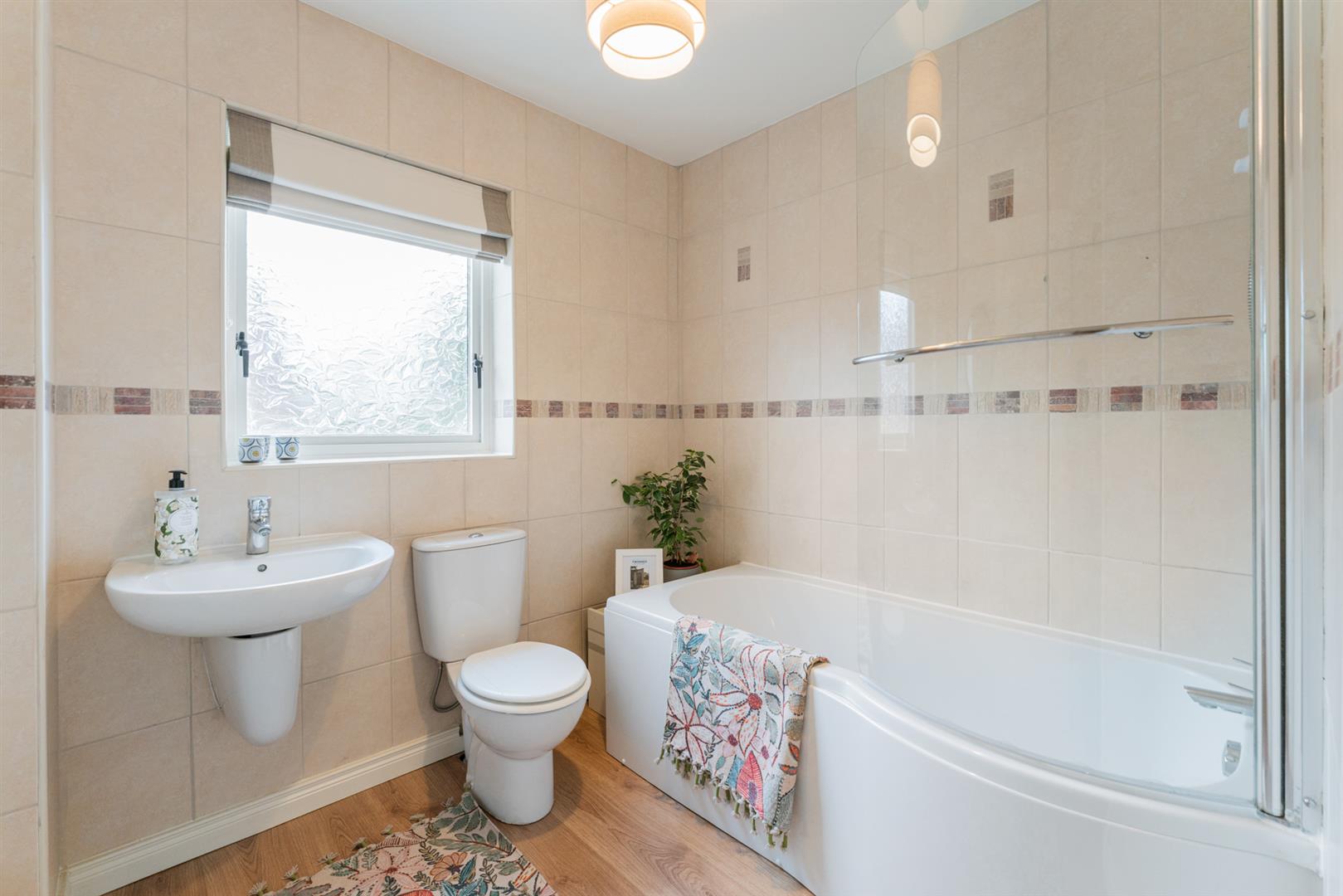 White bathroom suite comprising panelled bath with mixer tap, new "Mira" sprint electric shower, glazed shower screen. wall mounted hand basin with mixer tap, low flush wc, fully tiled walls, wood laminate flooring.