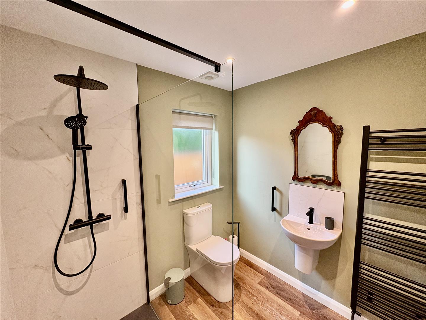 White suite comprising, walk in, wall mounted overhead shower, glass shower screen, wall mounted wash hand basin with mixer tap, partially tiled walls, heated towel rail, extractor fan and LVT flooring.