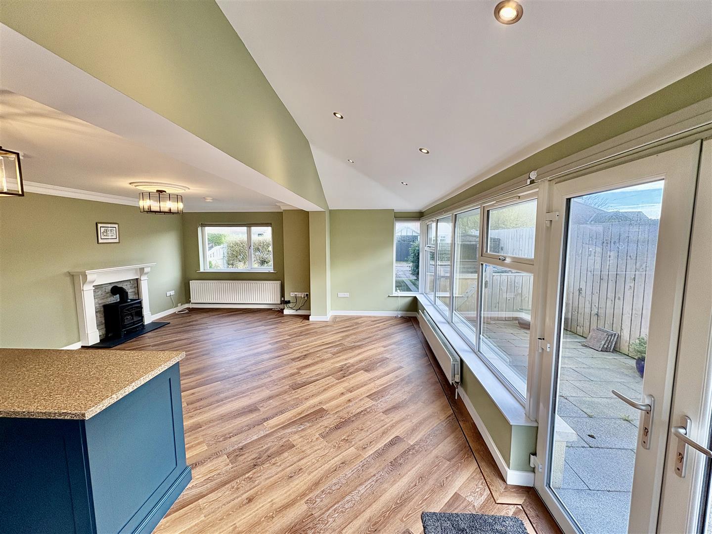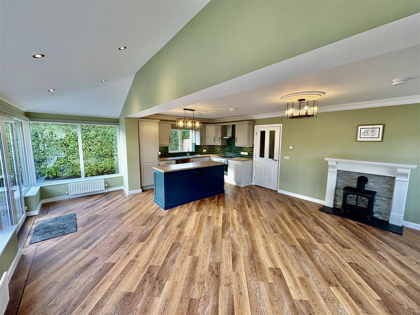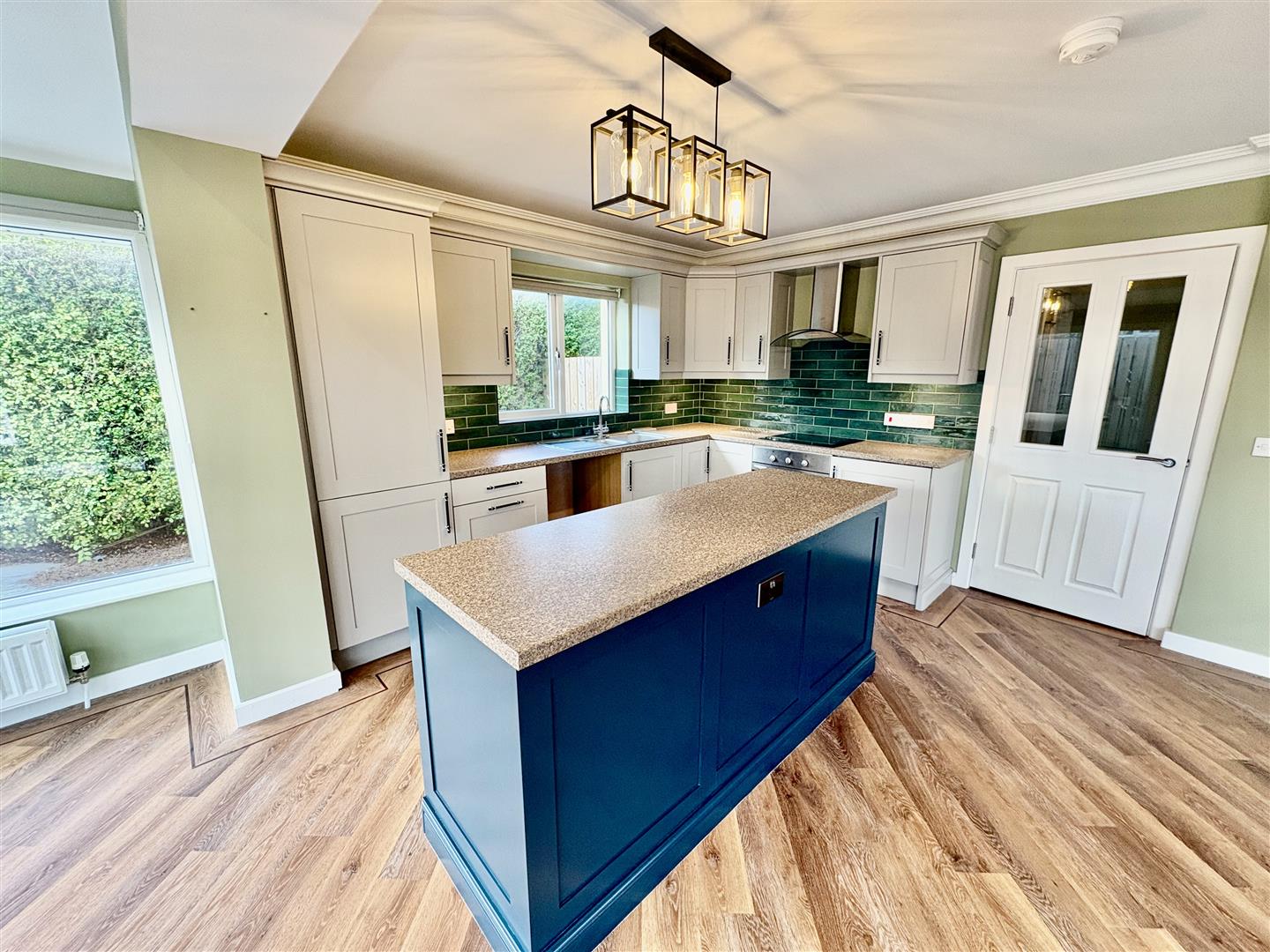 Modern fitted kitchen, range of high and low level units, granite effect work surfaces, one and a half inset stainless sink with mixer tap, integrated oven, four ring electric hob, tiled splashback, space for fridge, plumbed for washing machine, encased gas fired boiler, stainless steel extractor hood, island with storage, part tiled walls, space for dining, decorative marble fireplace with slate inset and hearth and electric fire, electric roller blinds, LVT flooring, double patio doors onto enclosed rear garden.