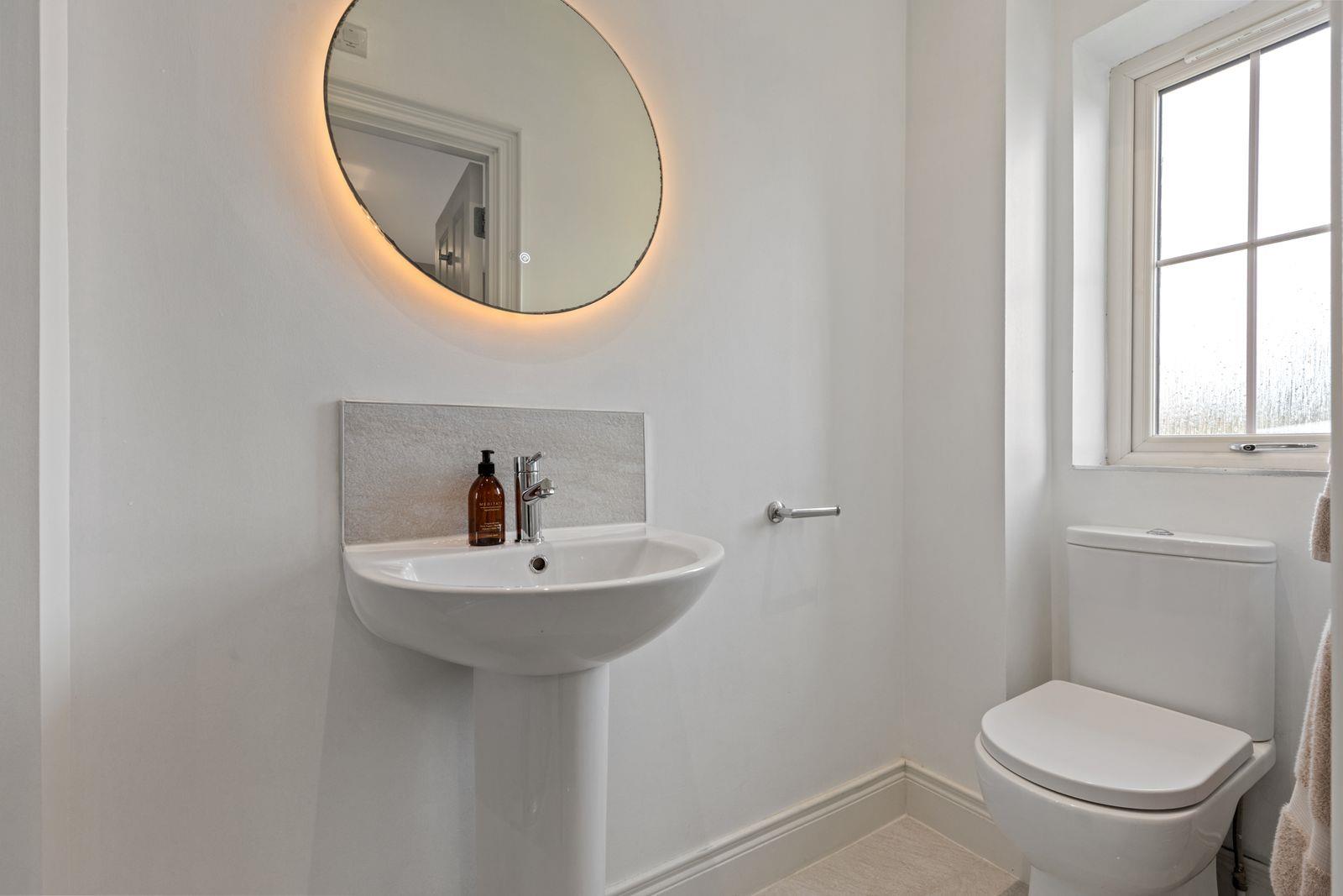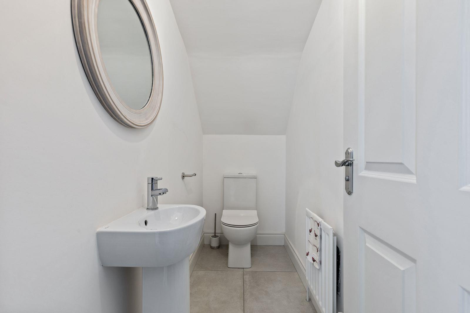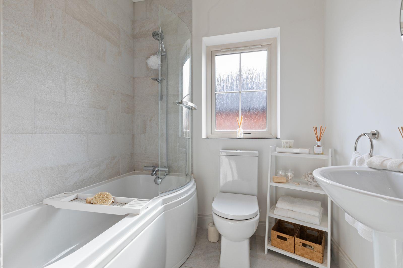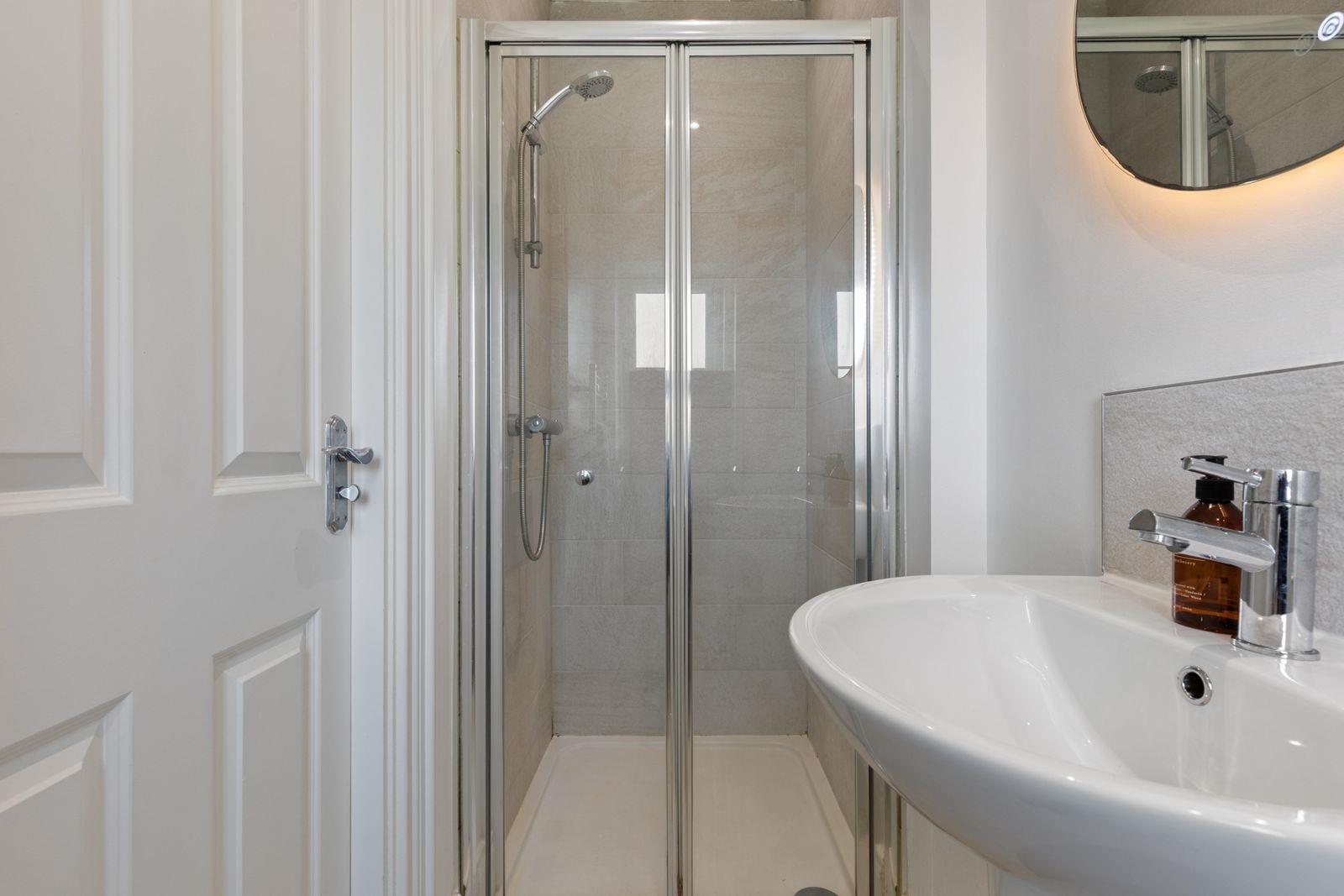 Tiled shower cubicle with thermostatic shower over. Pedestal wash hand basin with splash back. W.C. Built in extractor fan. Ceramic tiled floor. 3 down lights.