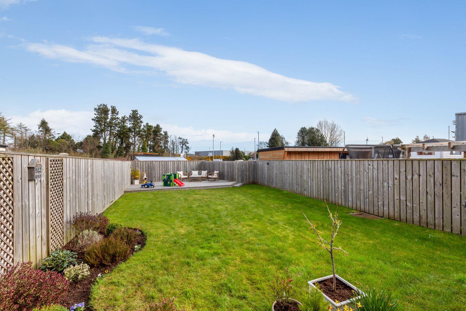 Enclosed garden in lawn. Paved patio. Decked patio. Light. Tap.