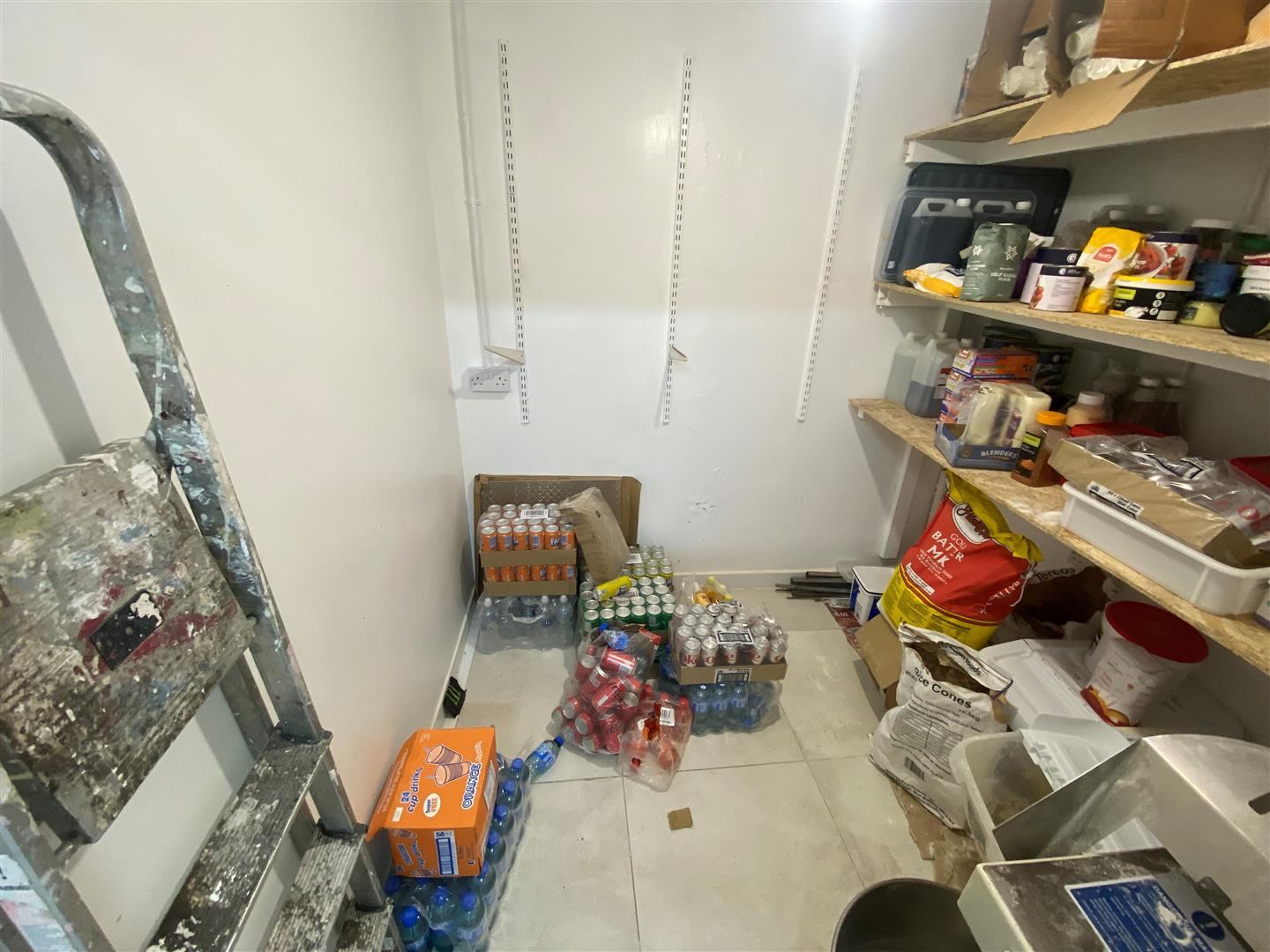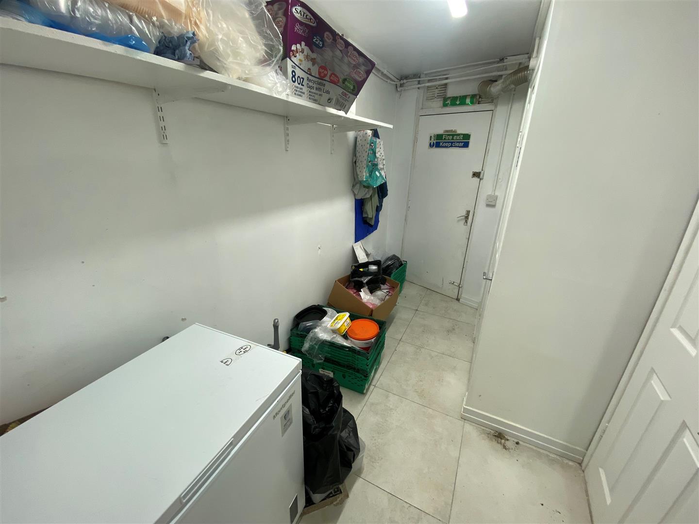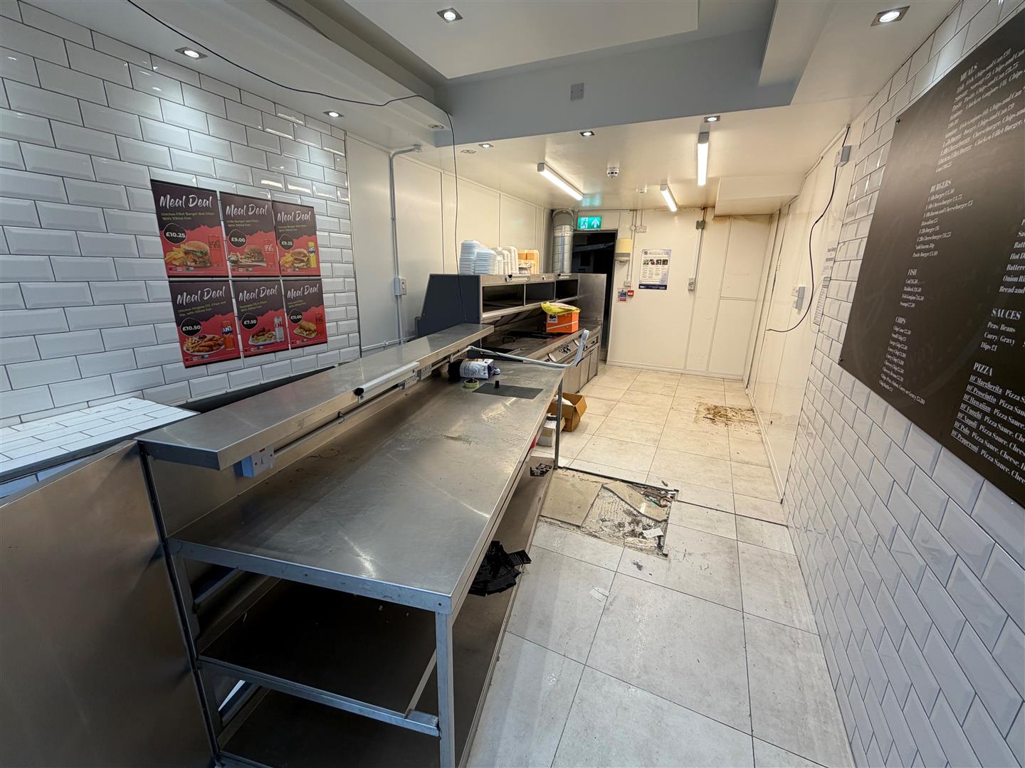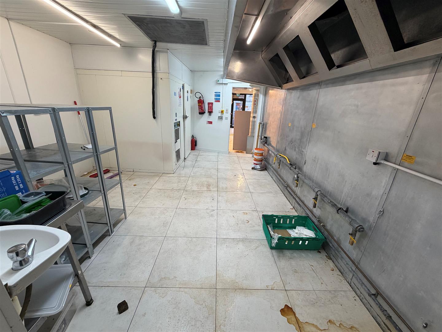 Twin stainless steel sink unit with mixer taps. Extractor canopy. Chiller. PVC ceiling. Ceramic tiled floor.