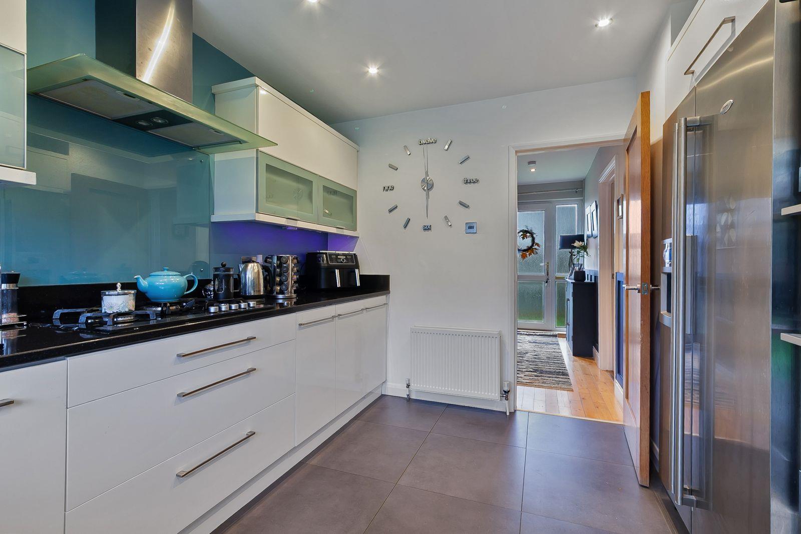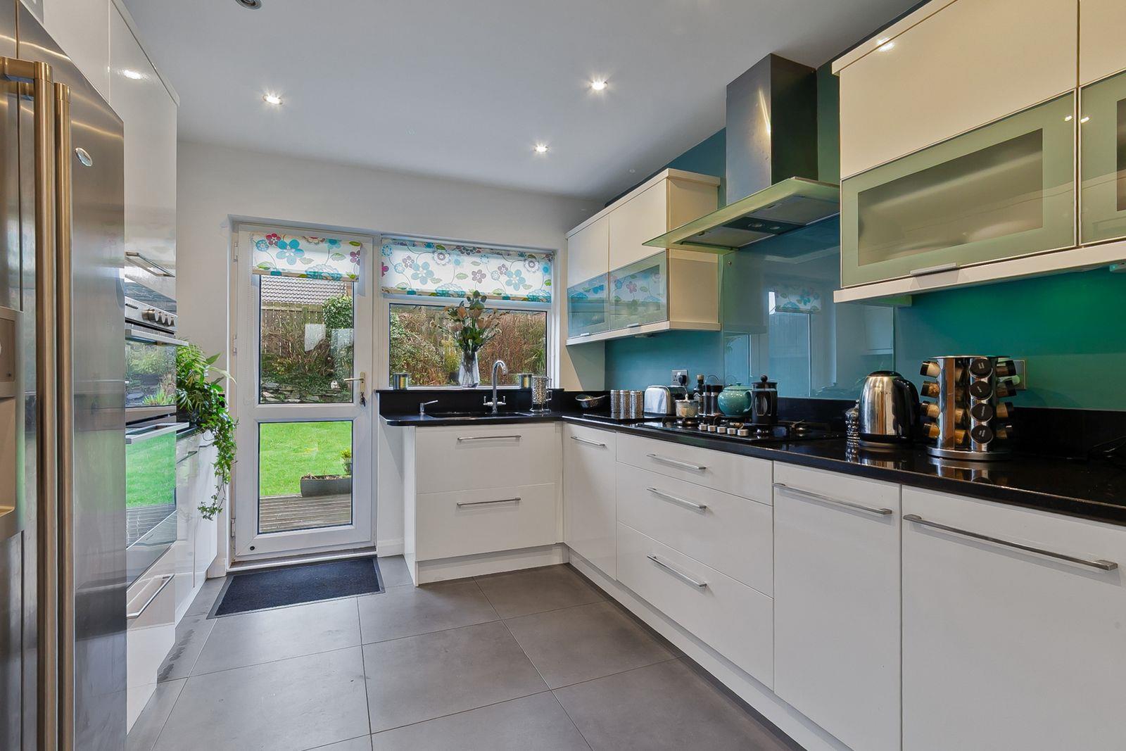 Range of white gloss high and low level cupboards and drawers with granite work surfaces incorporating unit display cabinets. Built-in Fisher & Paykel gas 5 ring hob and double oven. 11/2 tub single drainer sink unit with mixer tap. Ceramic tiled floor. 8 Downlights.