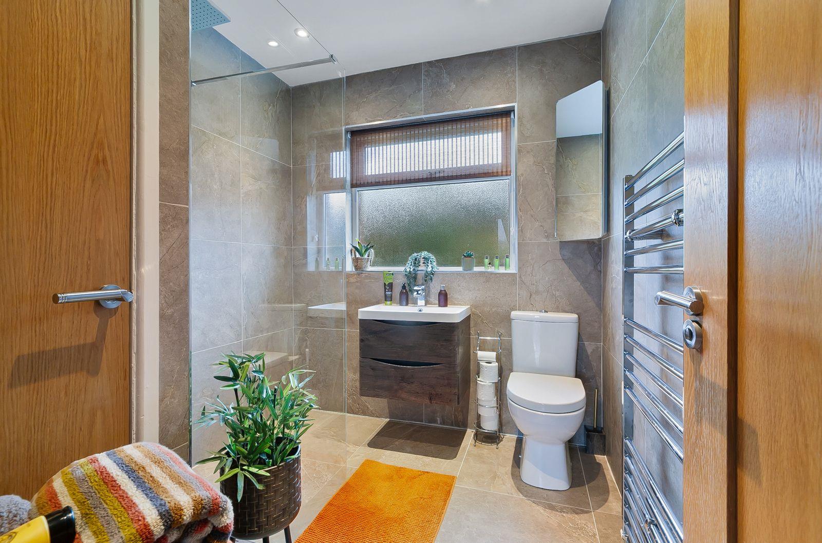 Walk-in shower with thermostatic shower and drencher. Vanity unit with inset wash hand basin and mixer tap. W.C. Tiled walls. Ceramic tiled floor. Built-in storage cupboard. Chrome heated towel rail. 3 Downlights.