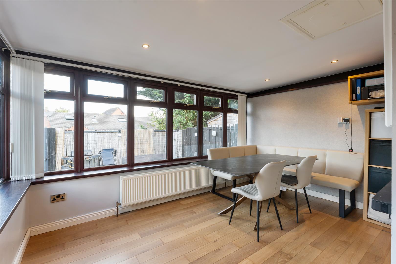 Mahogany effect uPVC double glazed window. Single panel radiator. Wooden laminate flooring.
