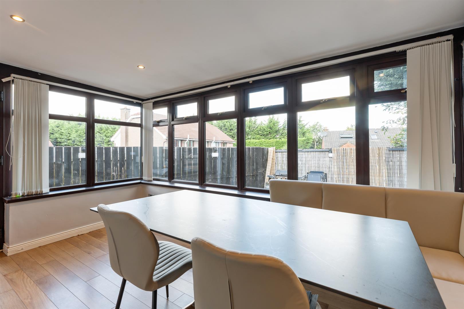 Mahogany effect uPVC double glazed windows and rear door. Wooden laminate flooring. Double panel radiator. Ceiling downlighters.