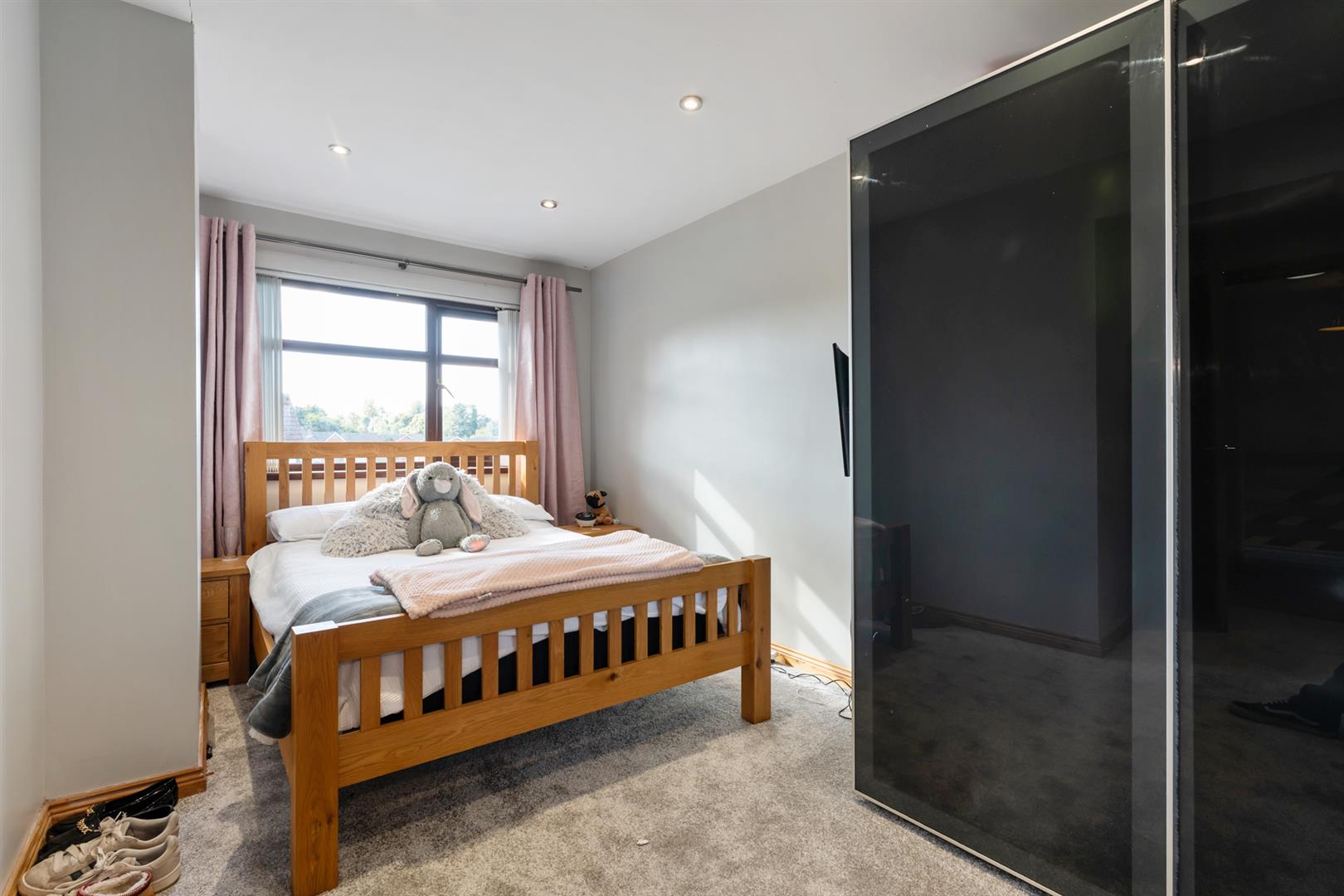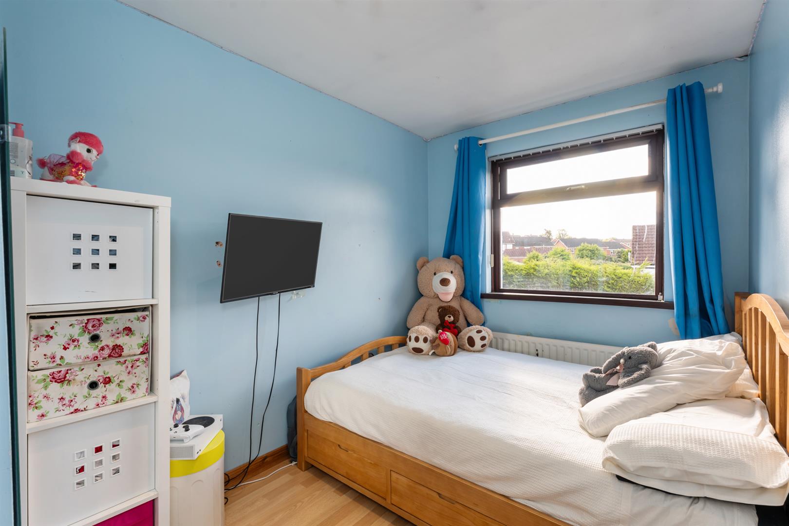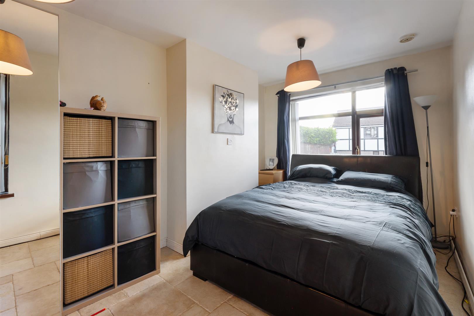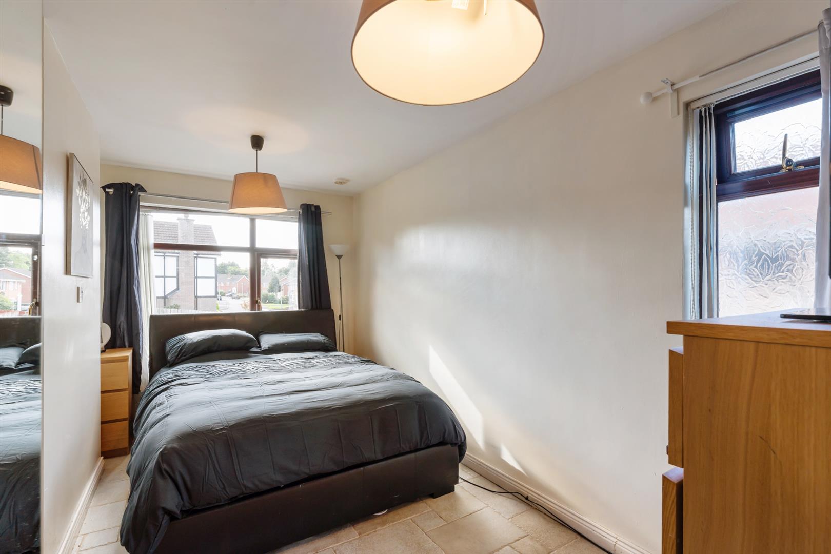 Mahogany effect uPVC double glazed windows. Single panel radiator. Wooden laminate flooring. Built-in wardrobe.