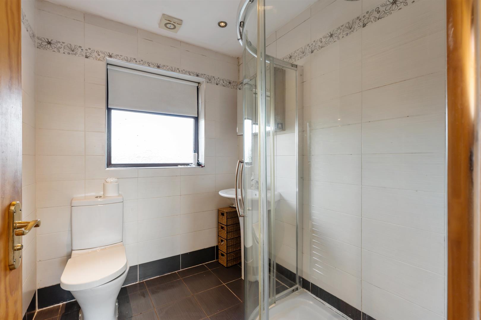 Mahogany effect uPVC double glazed windows. Low flush W.C. Pedestal wash hand basin with mixer tap. Tiled shower cubicle with shower and drencher. Tiled walls. Tiled floor. Extractor fan. Wall mounted heated towel rail.