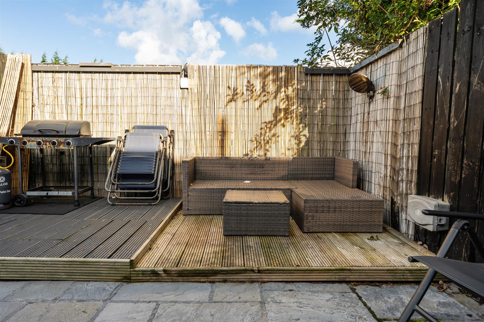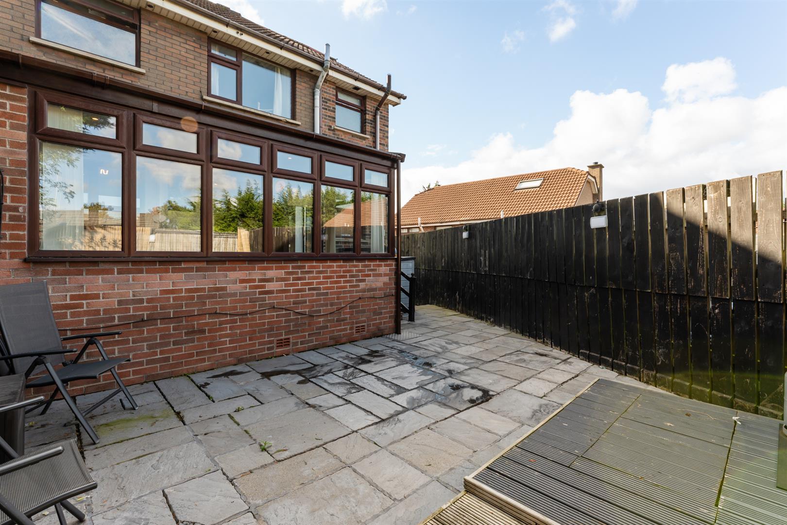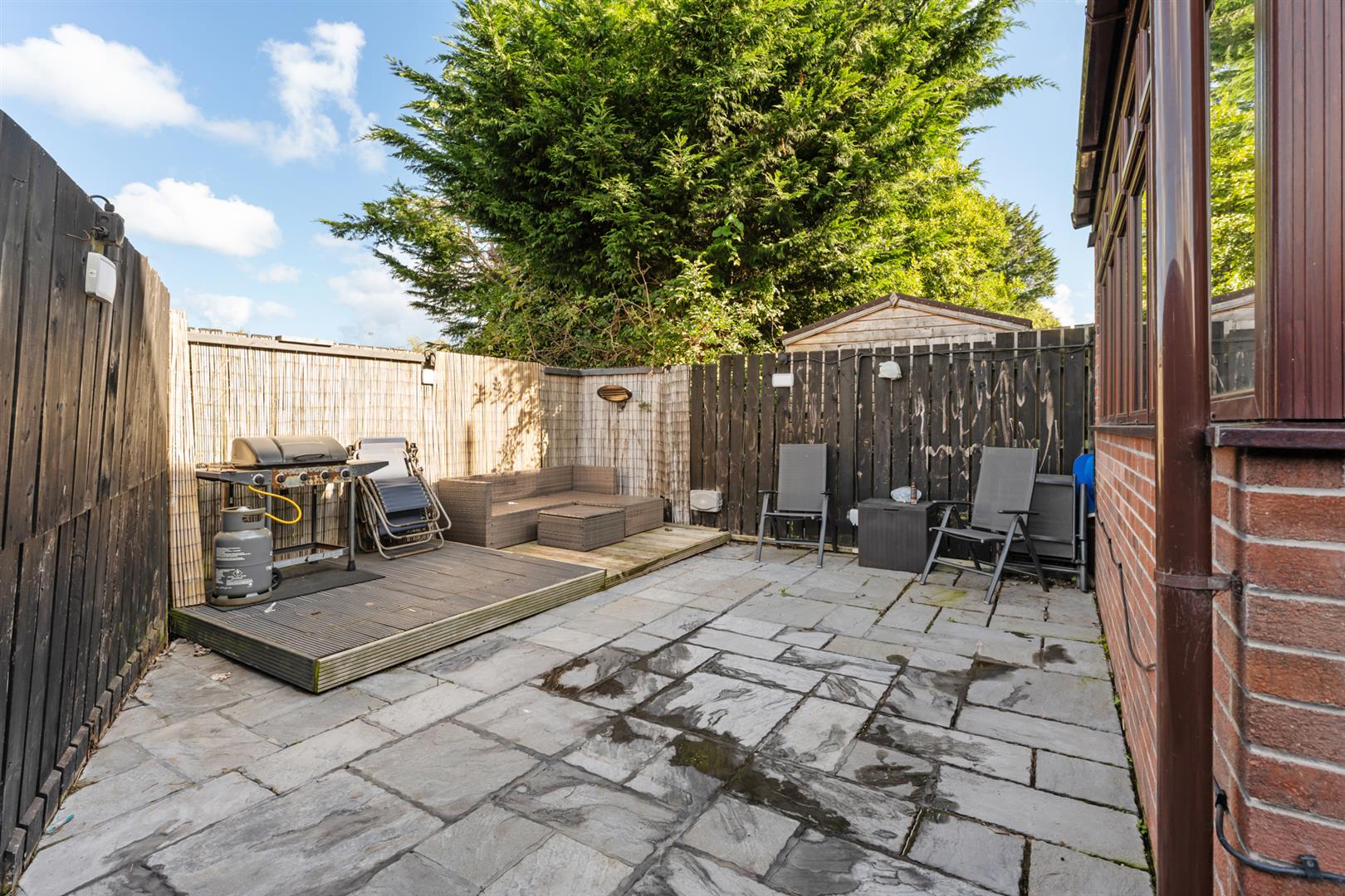 Mostly paved. Wooden decking. Security light point. Outside tap. Side gable with tarmac path.
