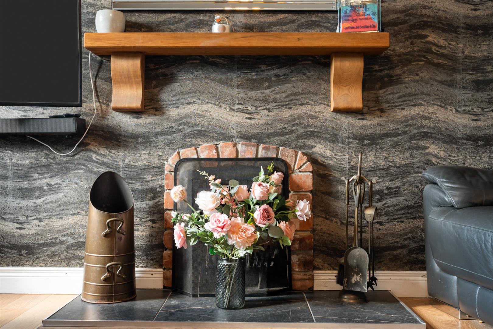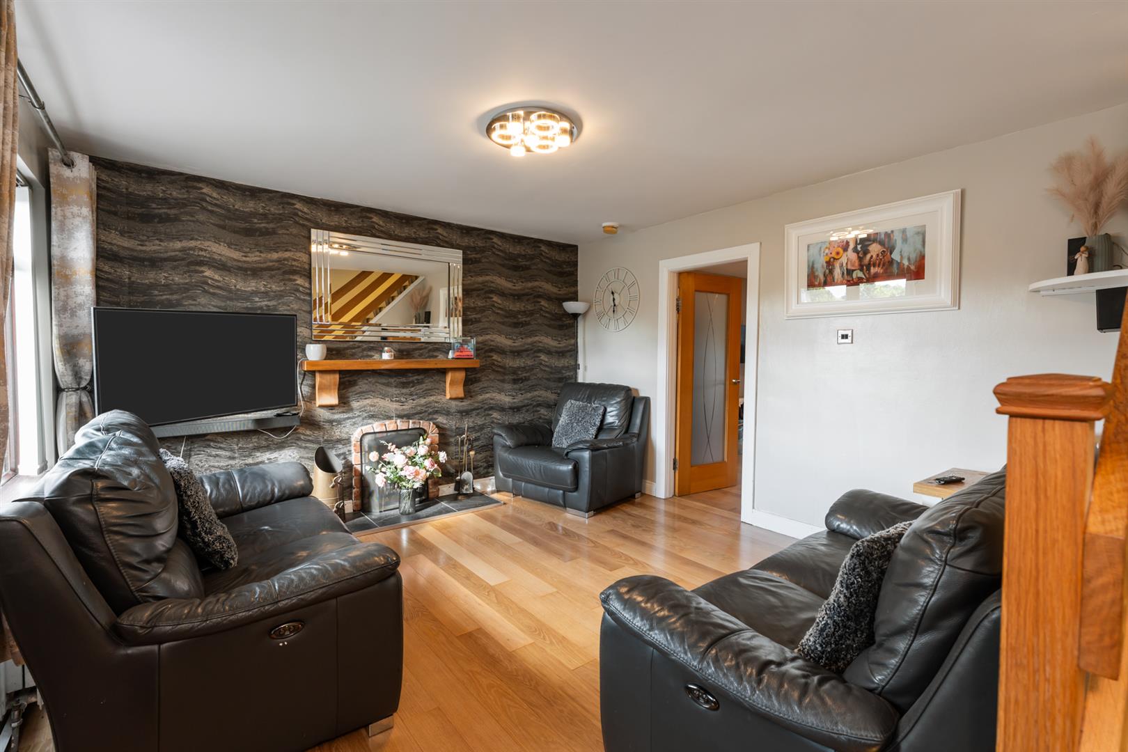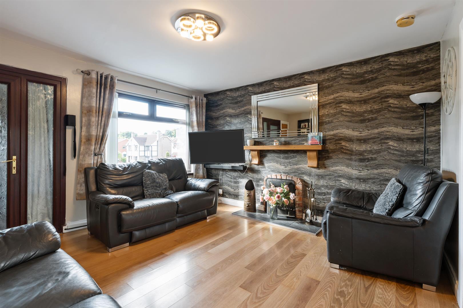 Mahogany effect uPVC double glazed windows. Wooden laminate flooring. Open fireplace with tiled hearth. Understairs storage cupboard.