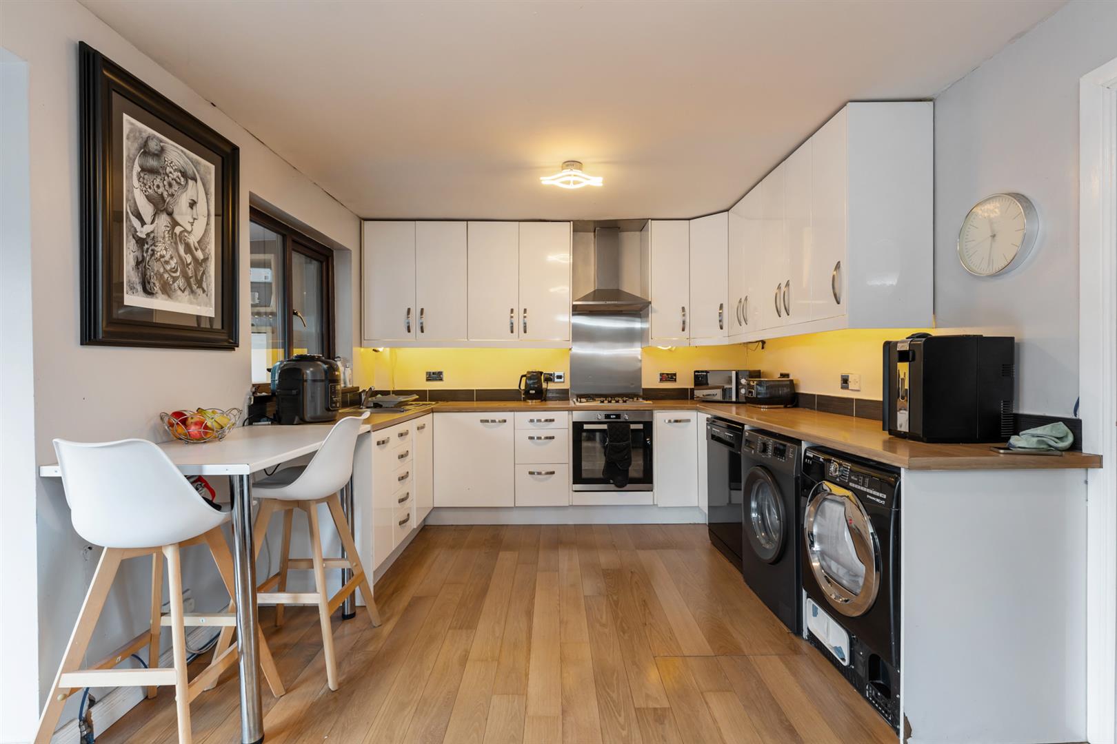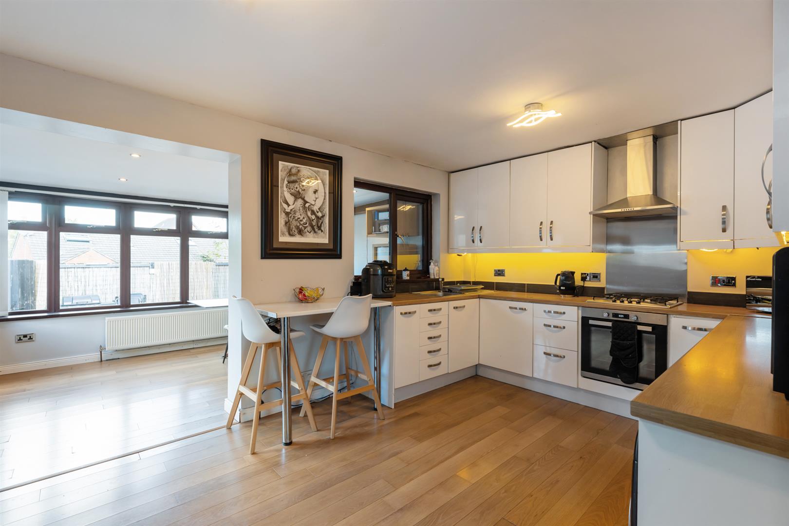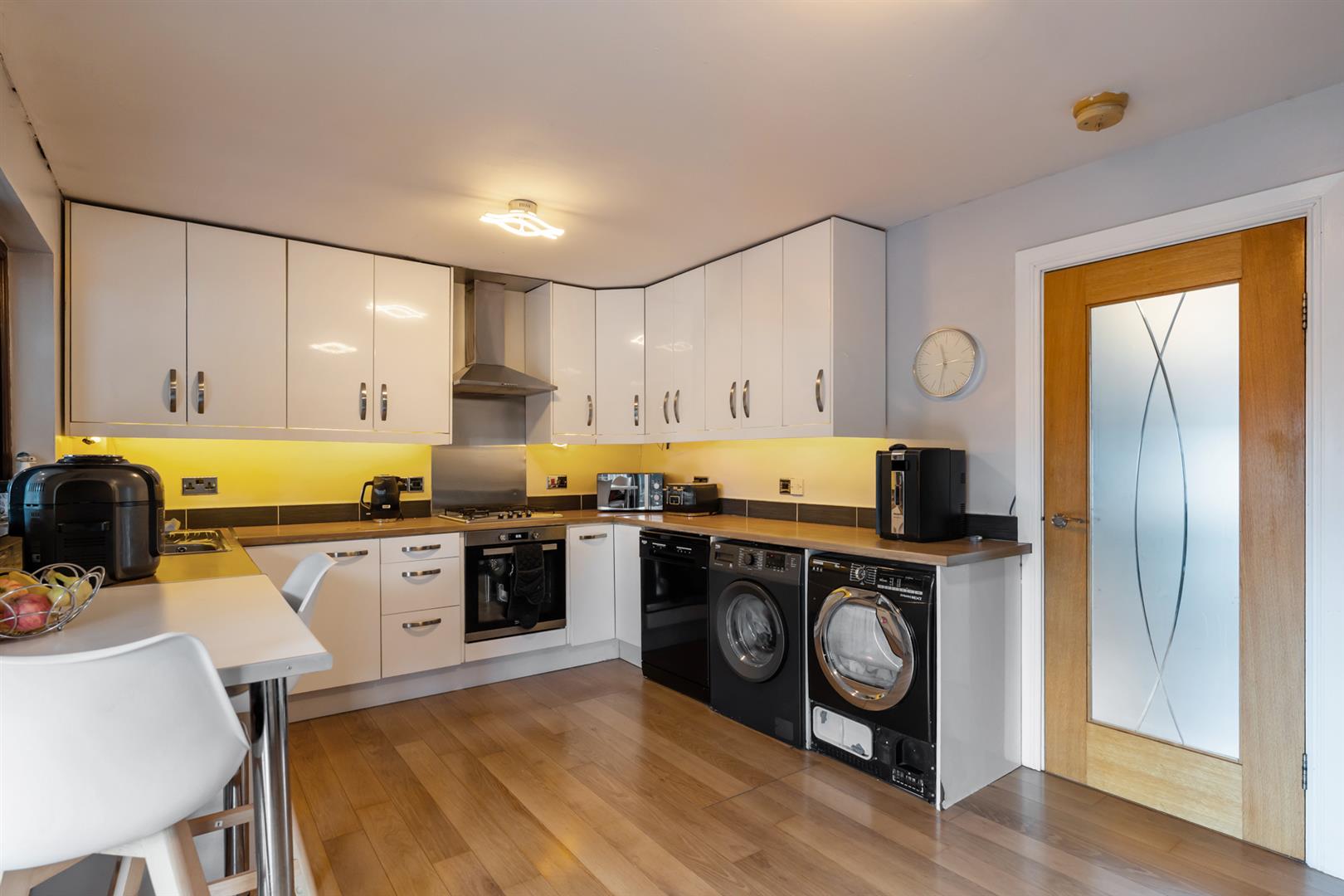High and low level units with roll edge work surfaces. Concealed lighting. Stainless steel sink unit with mixer taps. Integrated 4 ring gas hob and electric oven. Extractor fan. Plumbed for washing machine and dishwasher. Breakfast bar. Double panel radiator. Open plan to ...