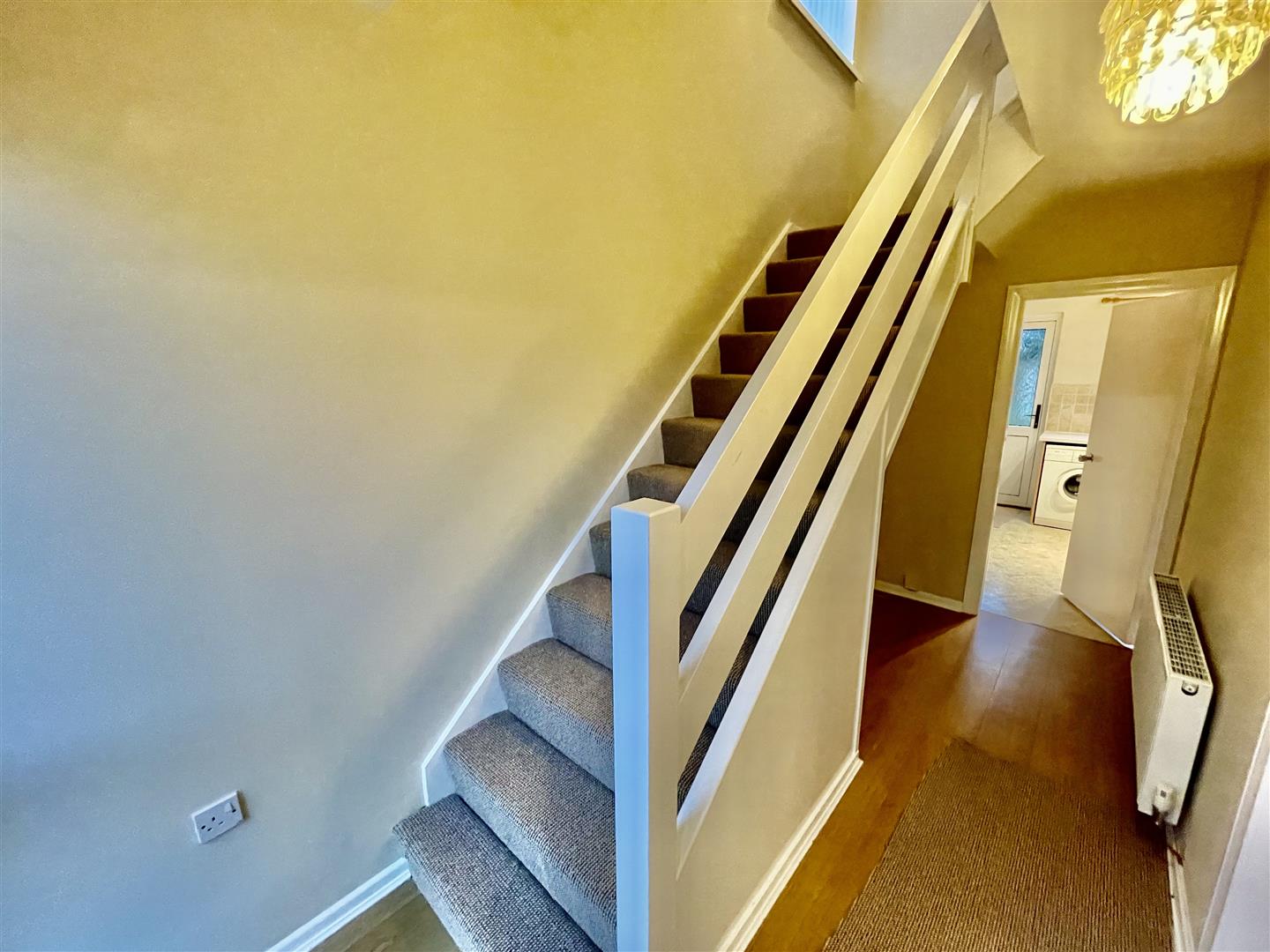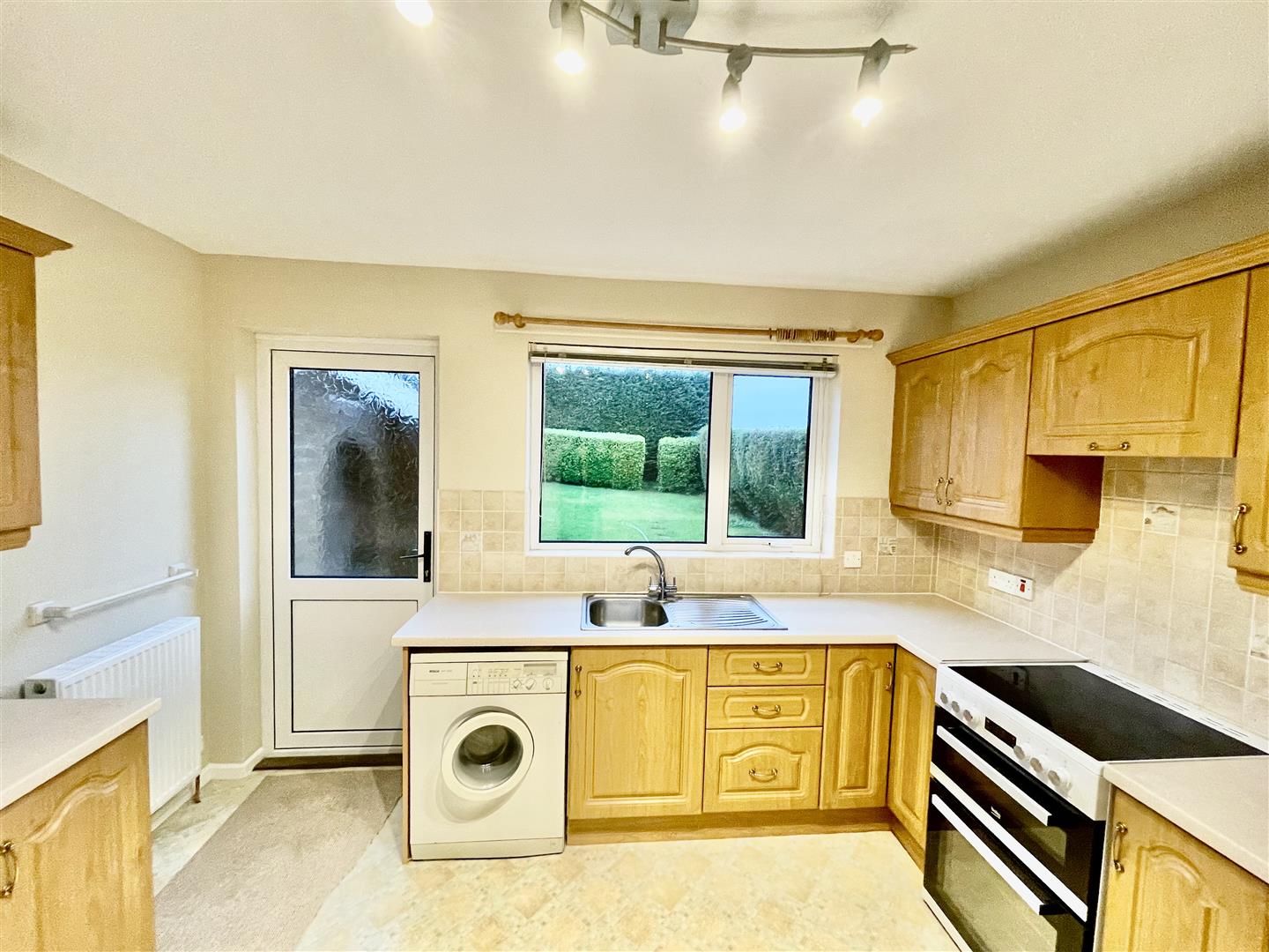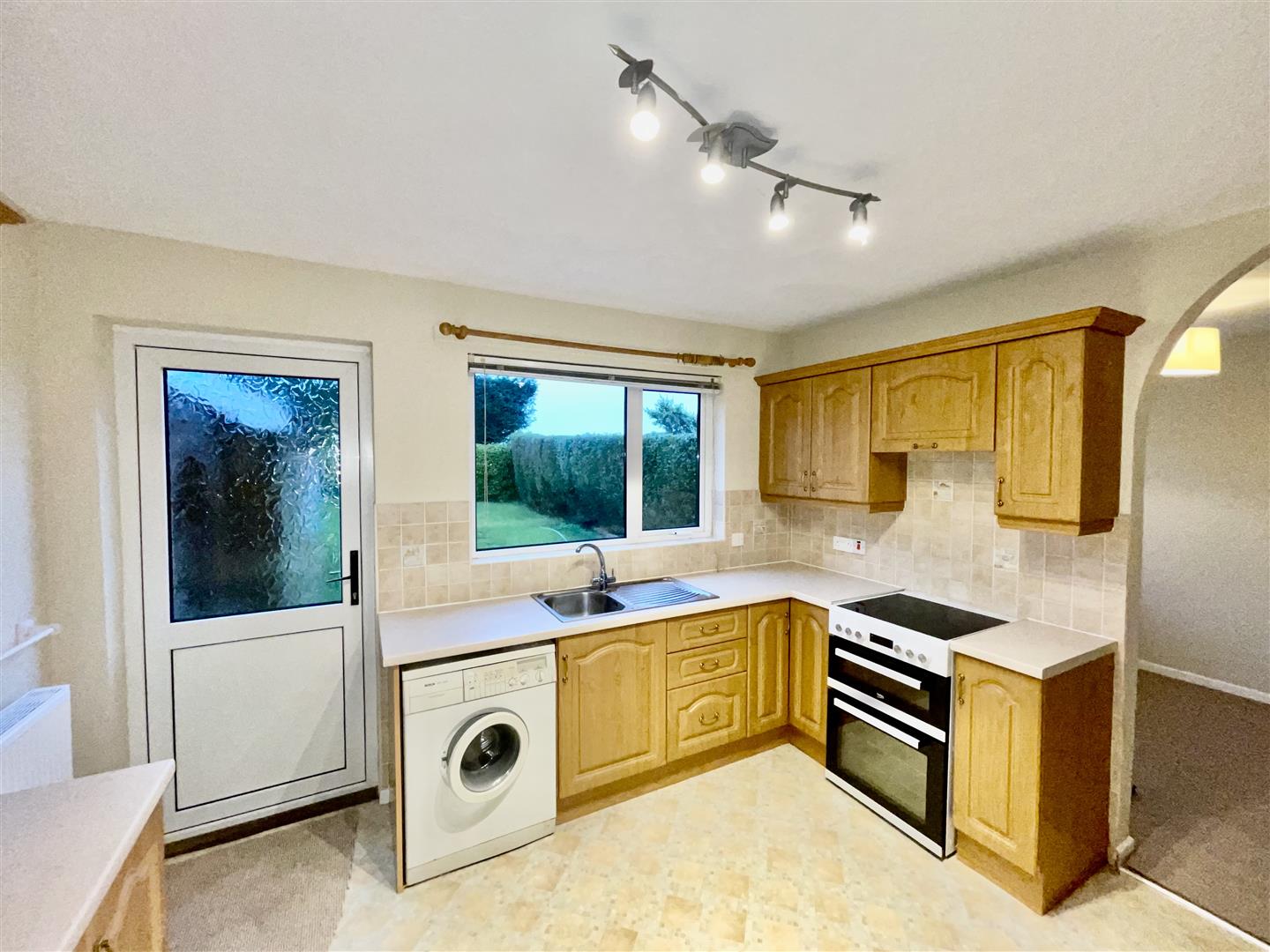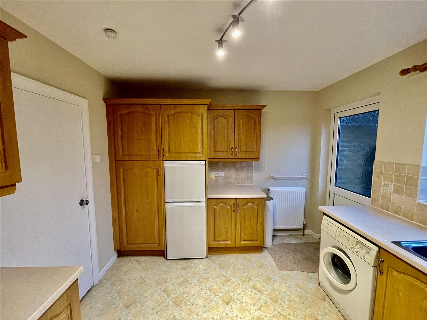 Fitted kitchen with range of high and low level units, laminate works surfaces, single stainless steel sink with mixer tap and drainer, cooker, integrated extractor fan, washing machine, fridge/freezer, partially tiled walls, back door to enclosed rear garden.