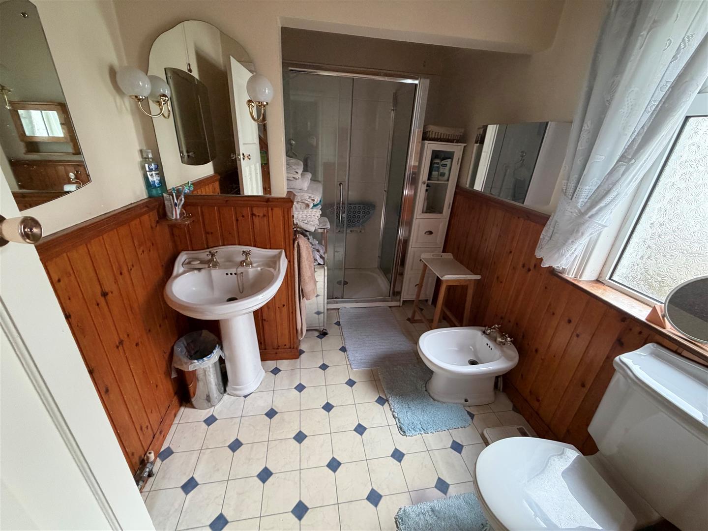 Comprising: Tiled shower cubicle with Briston electric shower. Pedestal wash hand basin. W.C. Part pine panelled walls and pine ceiling.
