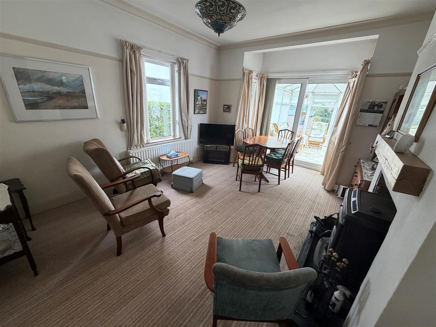Open fireplace with tiled surround and hearth. Cornice. Picture rail.