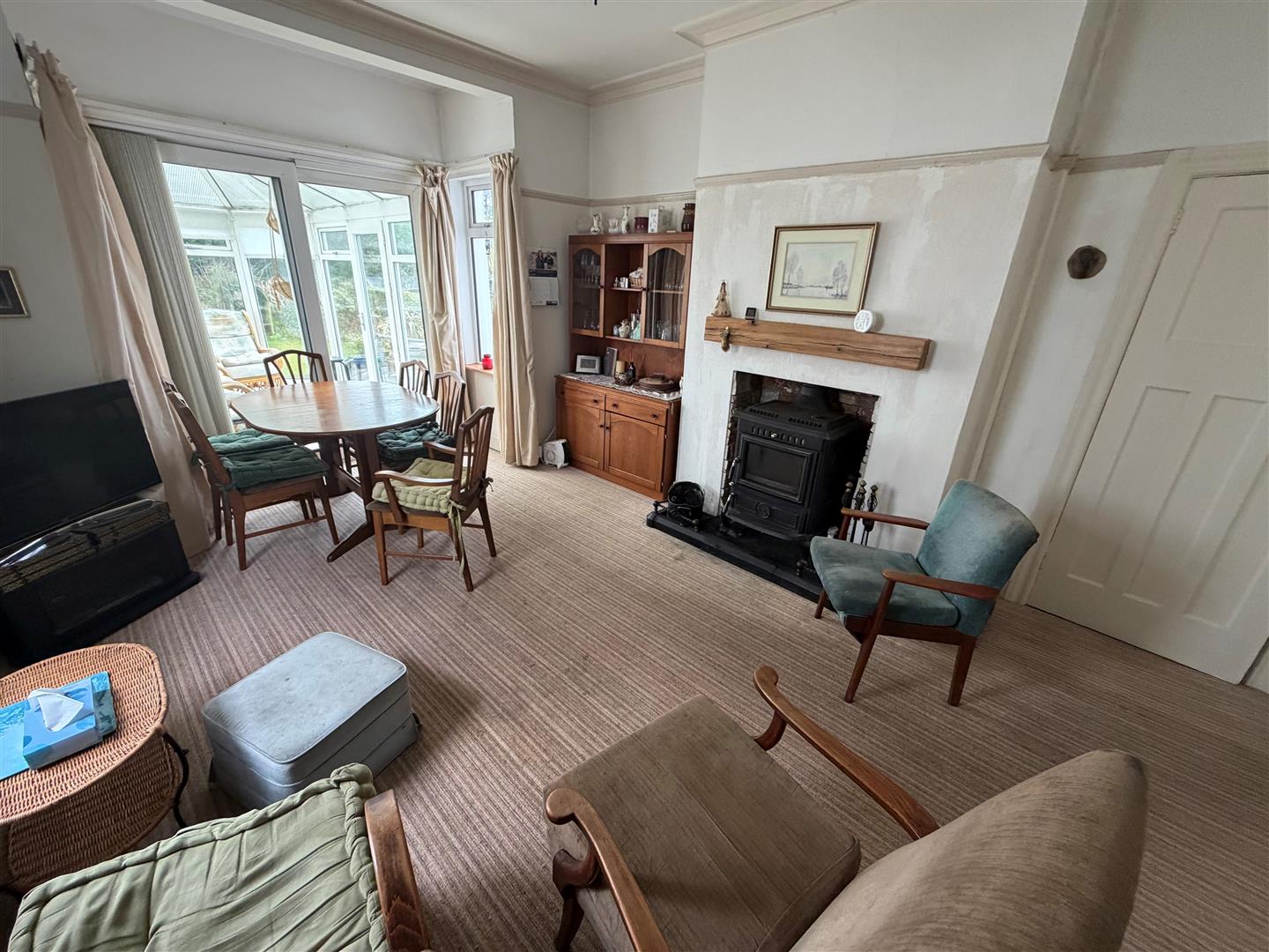 Open fireplace with multi-fuel stove, brick effect tiled surround and slate hearth with oak mantel. Cornice. Picture rail. uPVC double glazed patio door into ...