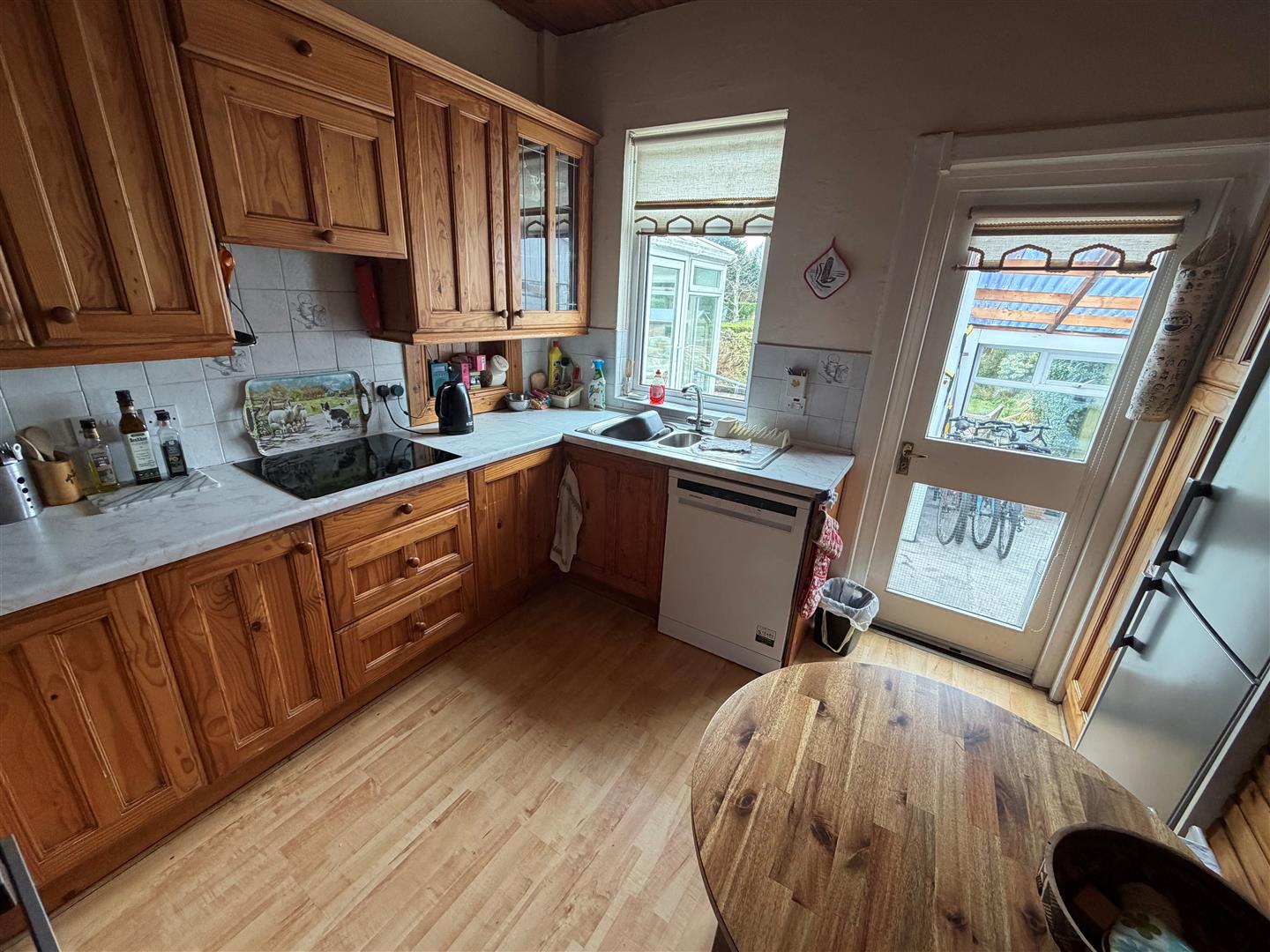 Range of oak high and low level cupboards and drawers with roll edge work surfaces. Built-in AEG 4 ring hob and Beko double oven. Extractor hood with integrated fan and light. 11/2 tub single drainer stainless steel sink unit with mixer tap. Plumbed for dishwasher. Part tiled walls. Pine ceiling.