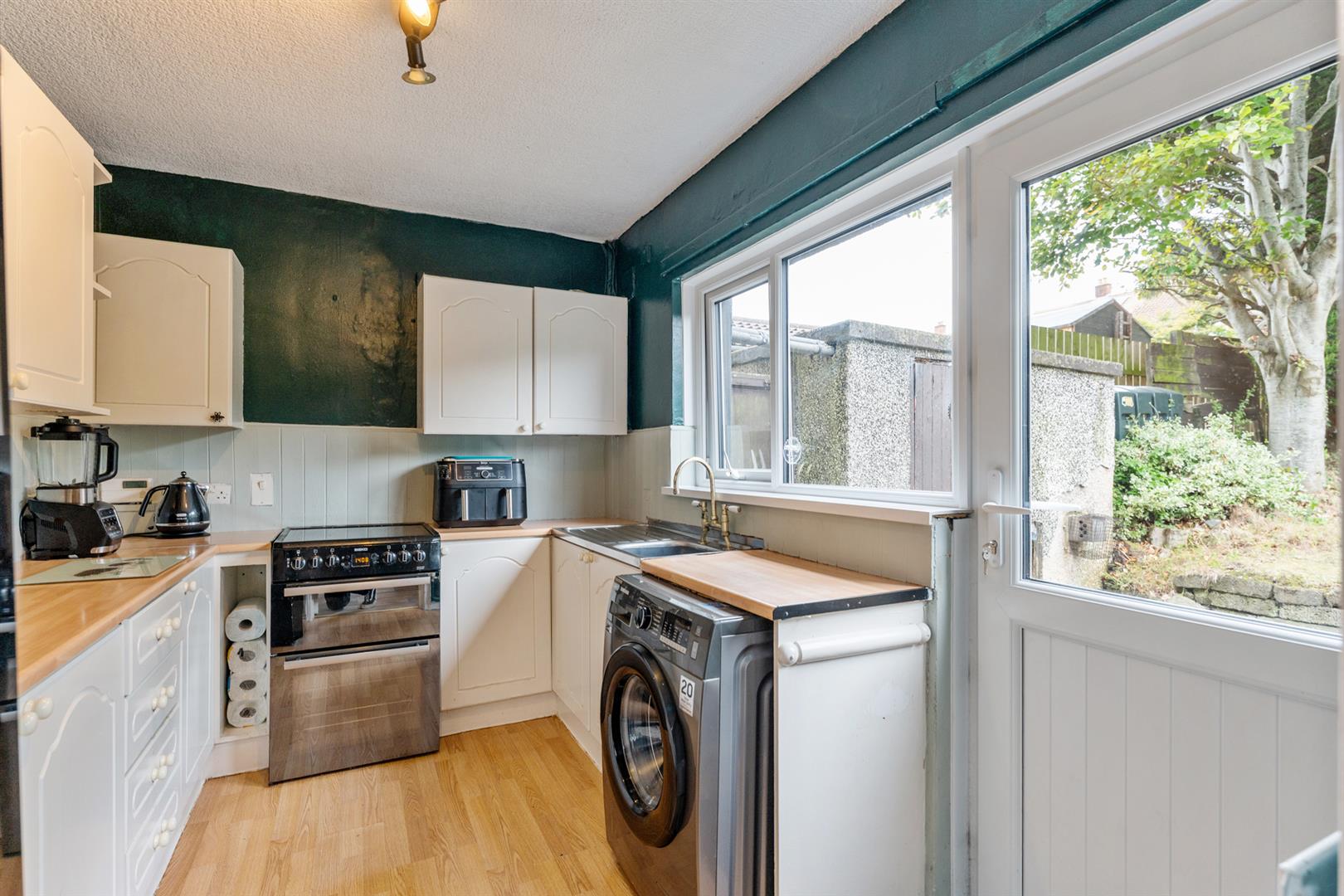 15 Pane single glazed internal door from lounge. High and low level units. Display shelves. Roll edge work surfaces. Stainless steel sink unit with mixer taps. Plumbed for washing machine. Wooden laminate flooring. Single panel radiator. White uPVC double glazed windows and rear door