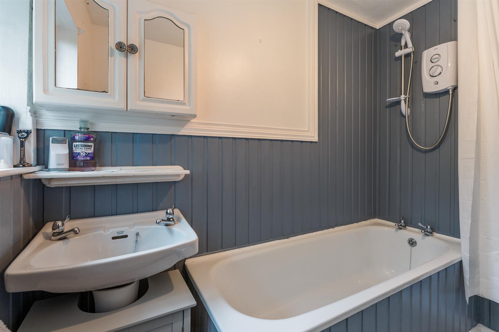 White suite comprising: Panelled bath with Triton electric shower over. Pedestal wash hand basin. Low flush W.c. Part panelled walls. White uPVC double glazed windows.
