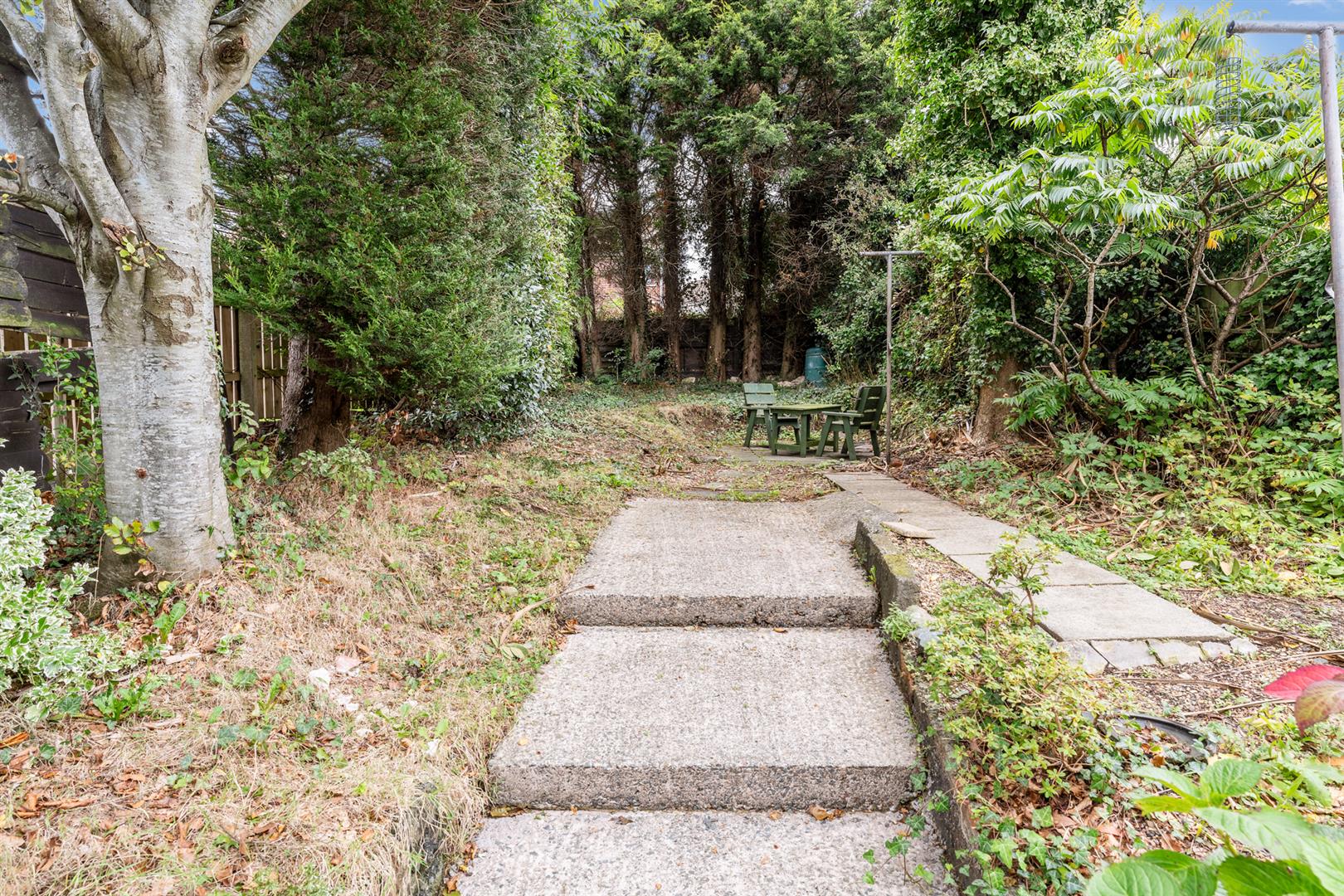 Shared pedestrian right of way from front. Garden laid in lawn. Garden store. Plants and shrubs. PVC oil tank. Paved patio. Outside tap and light.