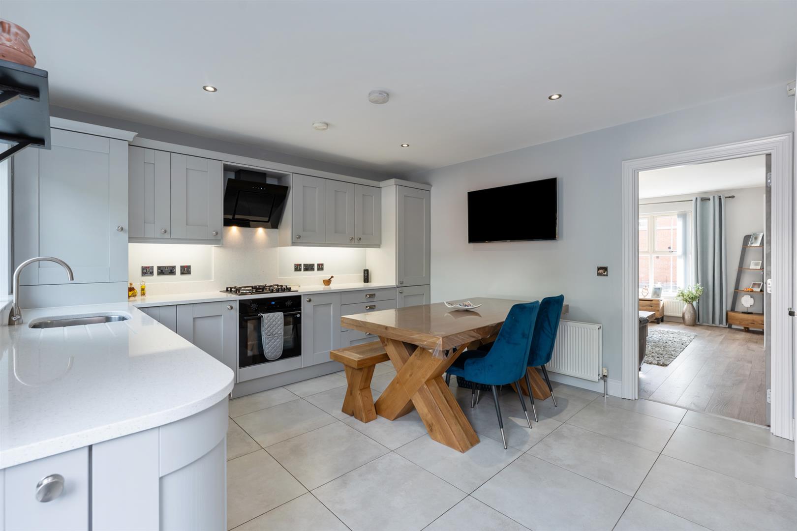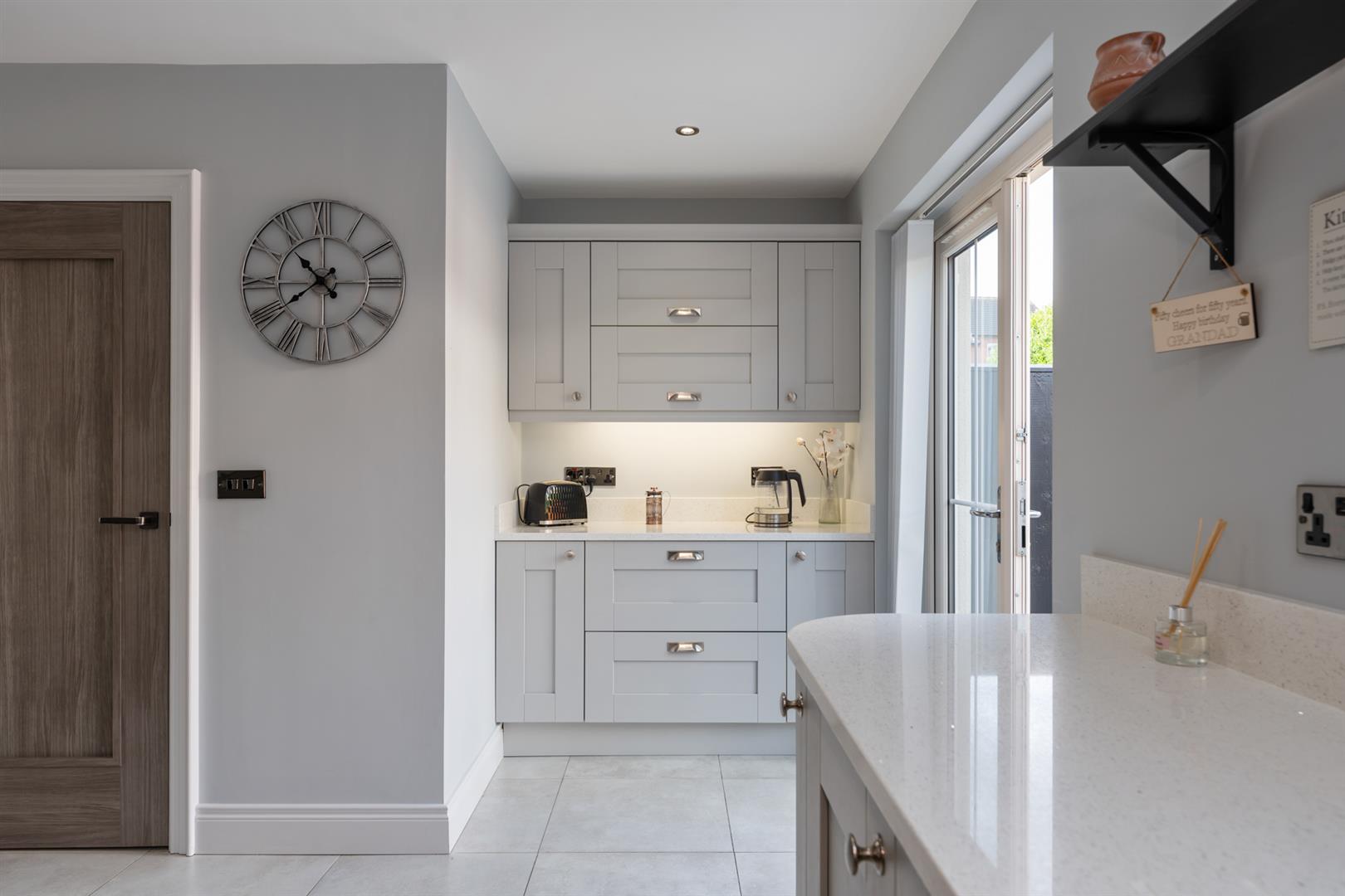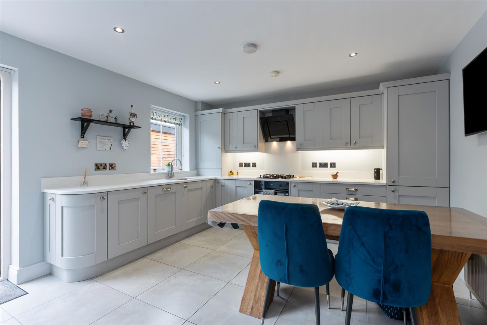 Range of grey high and low level cupboards and drawers with Quartz work surfaces. Built-in Creda gas 4 ring hob and Samsung oven under. Extractor hood with integrated fan and light. Integrated fridge/freezer and Hotpoint dishwasher. Ceramic tiled floor. 5 Downlights. uPVC double glazed French doors leading to rear.