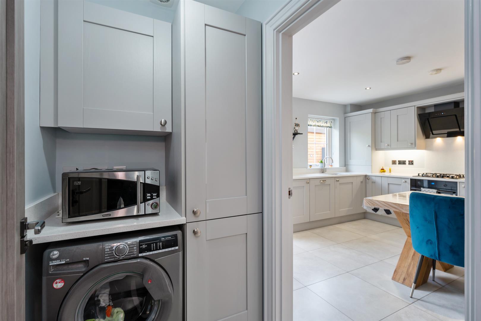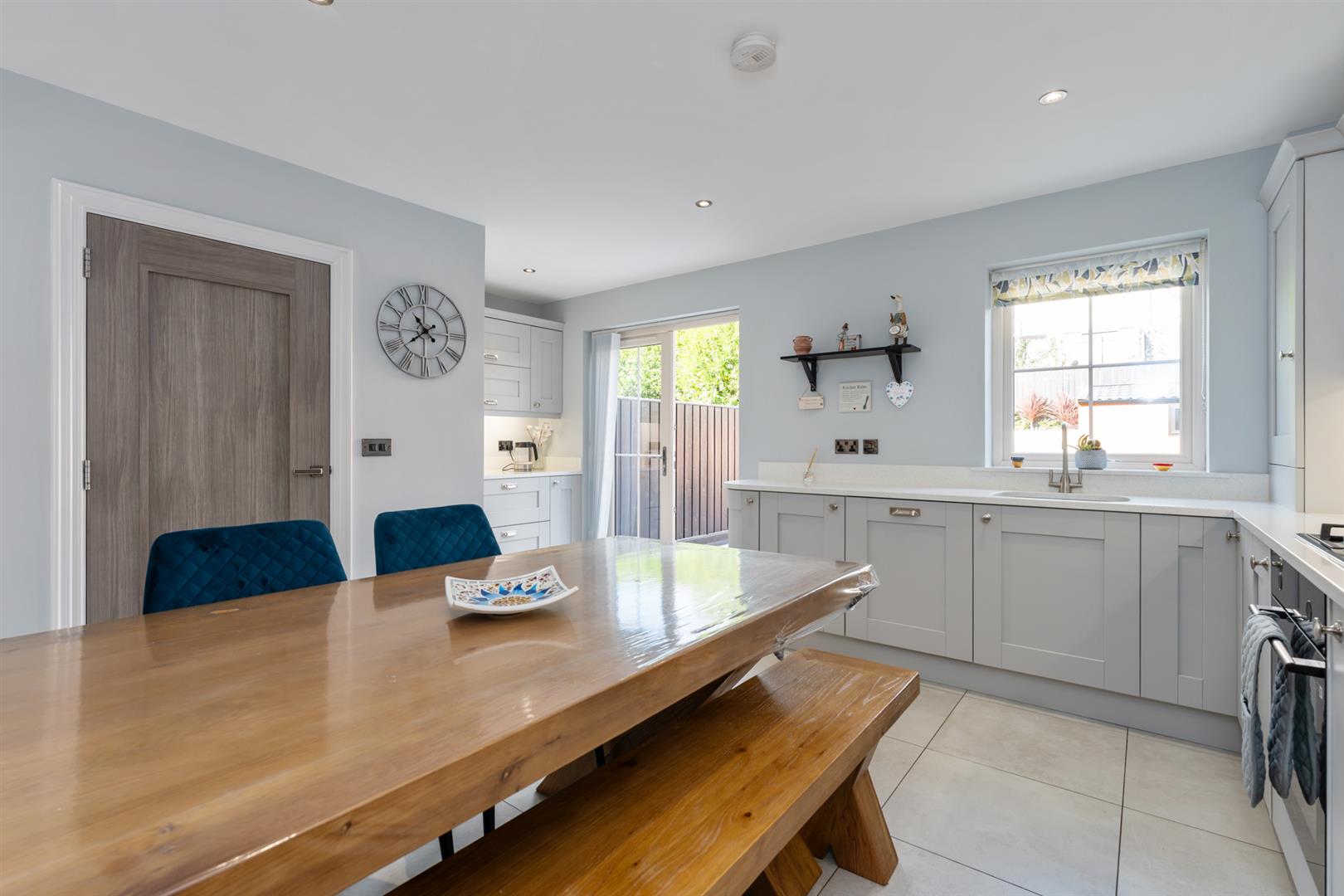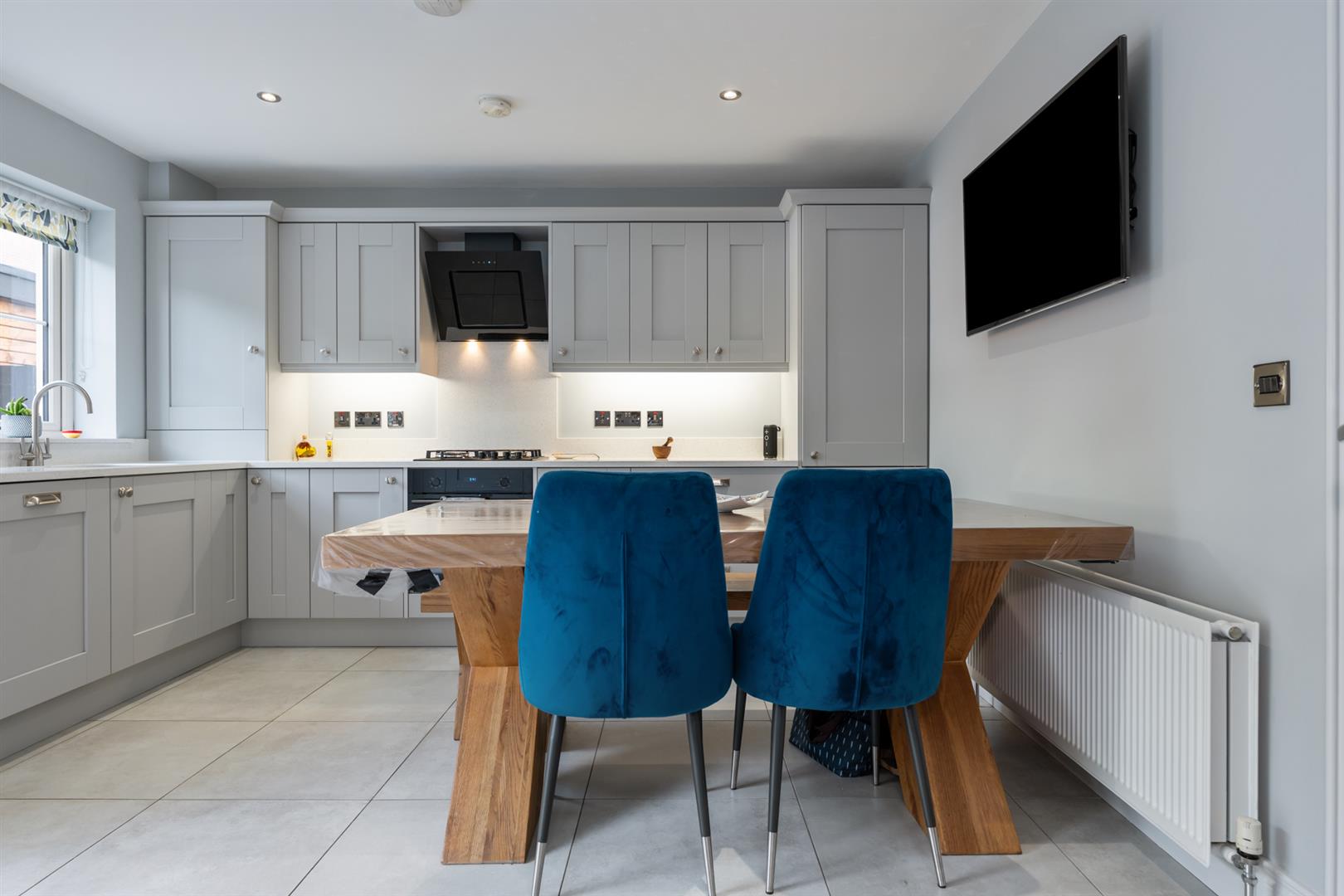 Range of grey high and low level cupboards and drawers with Quartz work surfaces. Built-in Creda gas 4 ring hob and Samsung oven under. Extractor hood with integrated fan and light. Integrated fridge/freezer and Hotpoint dishwasher. Ceramic tiled floor. 5 Downlights. uPVC double glazed French doors leading to rear.