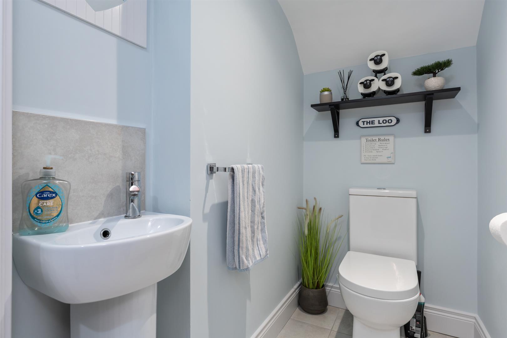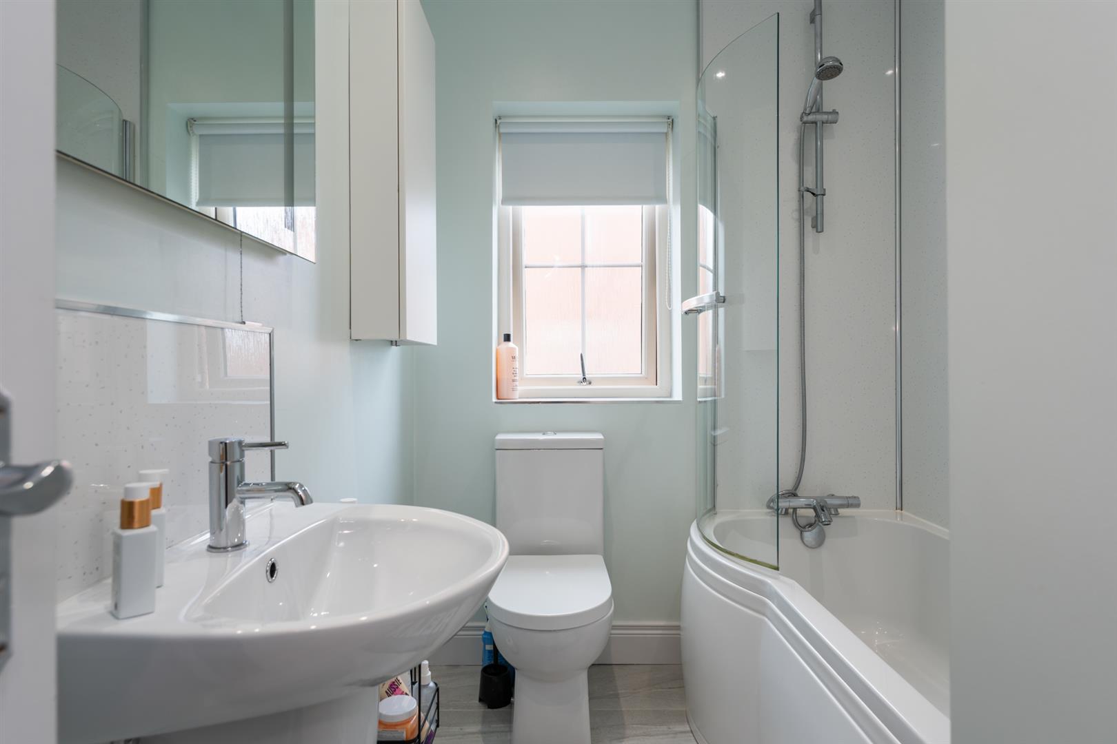 White suite comprising: Panelled bath with mixer taps and telephone shower attachment. Wash hand basin with mixer taps. W.C. Part panelled walls. Ceramic tiled floor. 3 Downlights. Built-in extractor fan. Chrome heated towel rail.