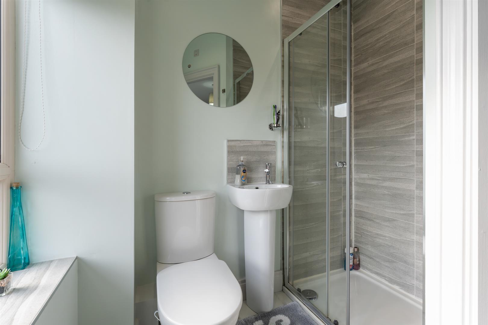Comprising: Tiled shower cubicle with Thermostatic shower over. Pedestal wash hand basin with mixer taps and splash back. W.C. Ceramic tiled floor. Chrome heated towel rail. 2 Downlights. Built-in extractor fan.