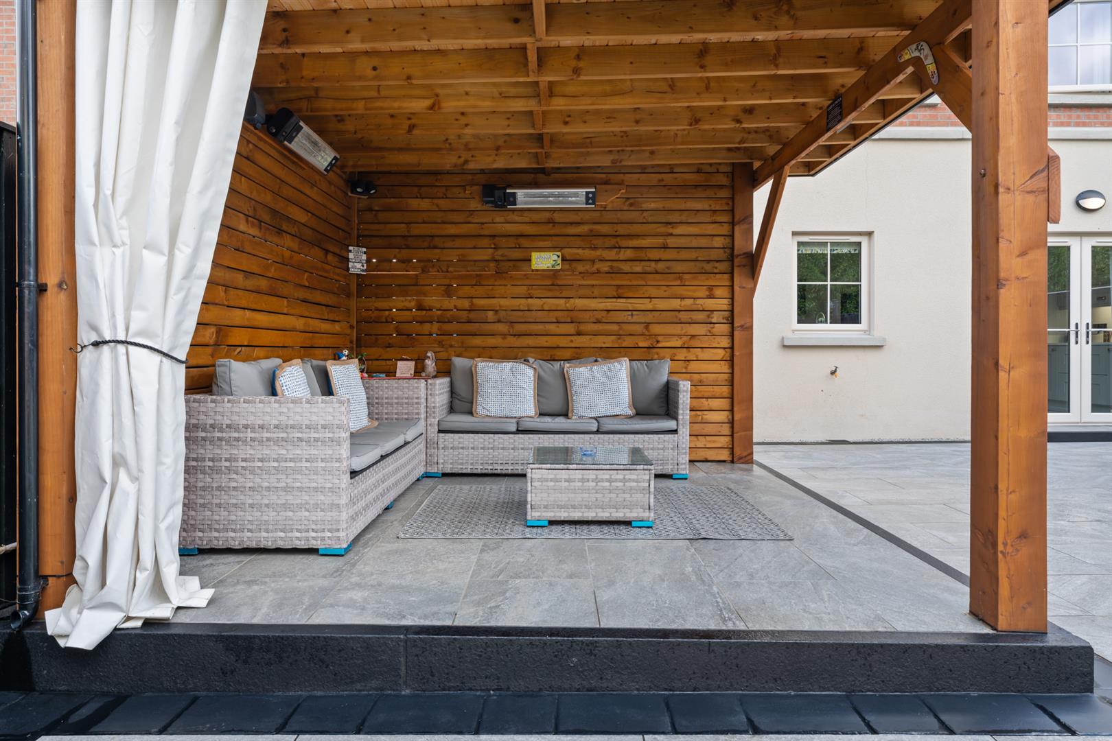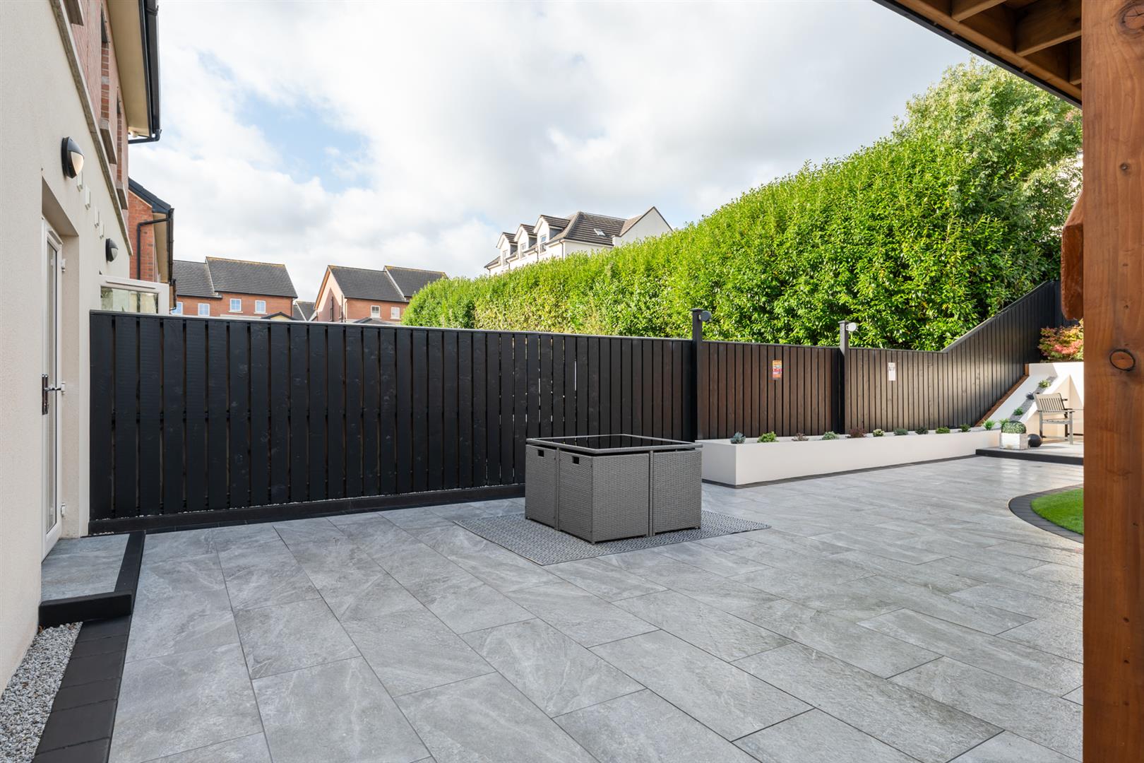 Enclosed garden in lawn. Tiled patio with raised flowerbeds. Covered patio/dining area. Light and power.