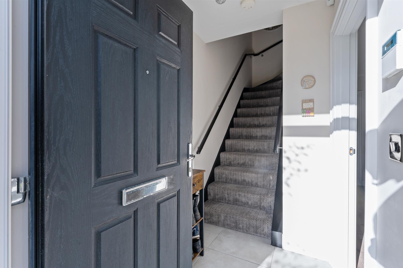 Laminated wood floor. Electric wall mounted fire. Glazed door into ...