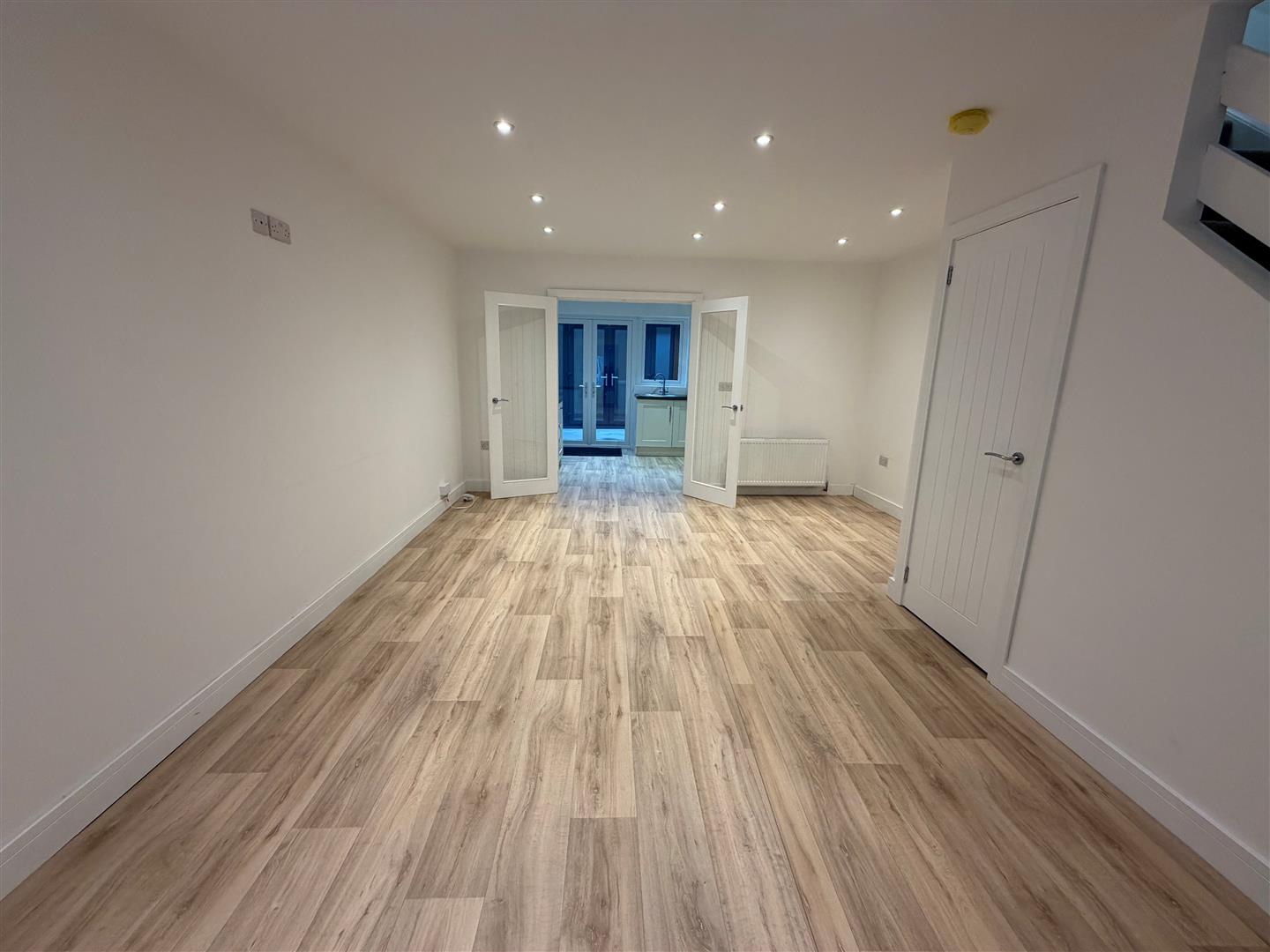 Understairs storage cupboard. TV point. 12 Downlights. Glazed double doors into ...