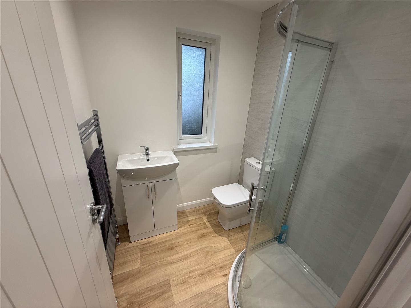 Corner shower with thermostatic shower over and Drencher. Vanity unit with inset wash hand basin and mixer tap. W.C. Chrome heated towel rail. Built-in extractor fan. 4 Downlights.