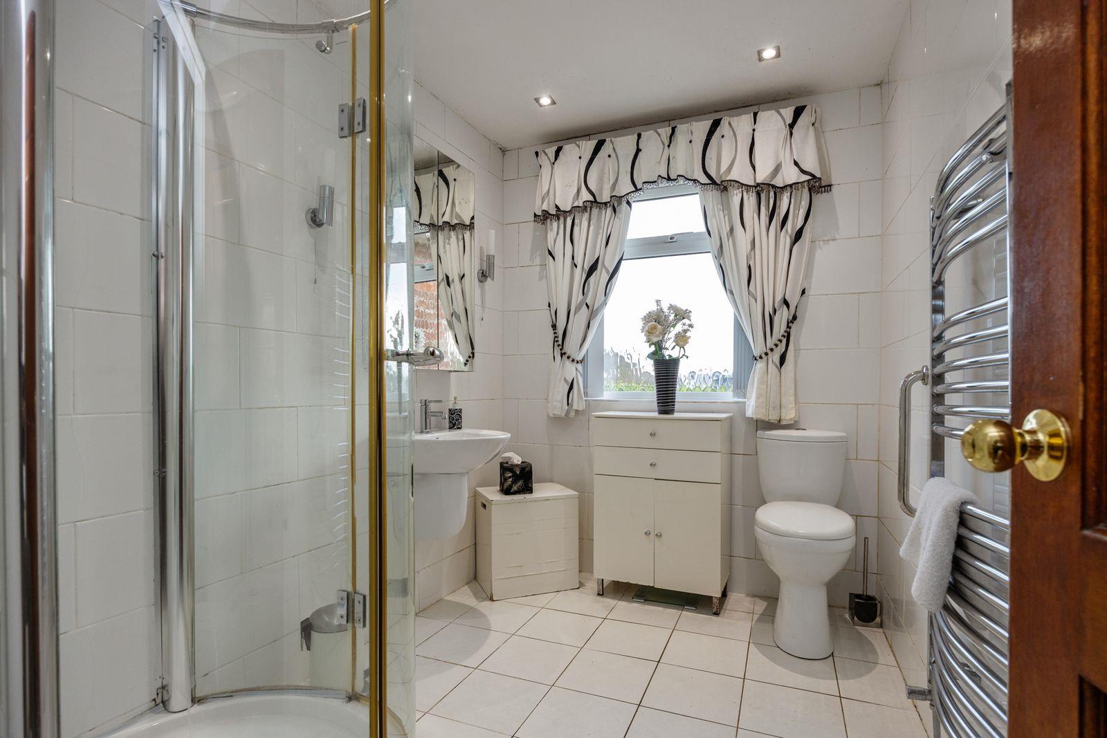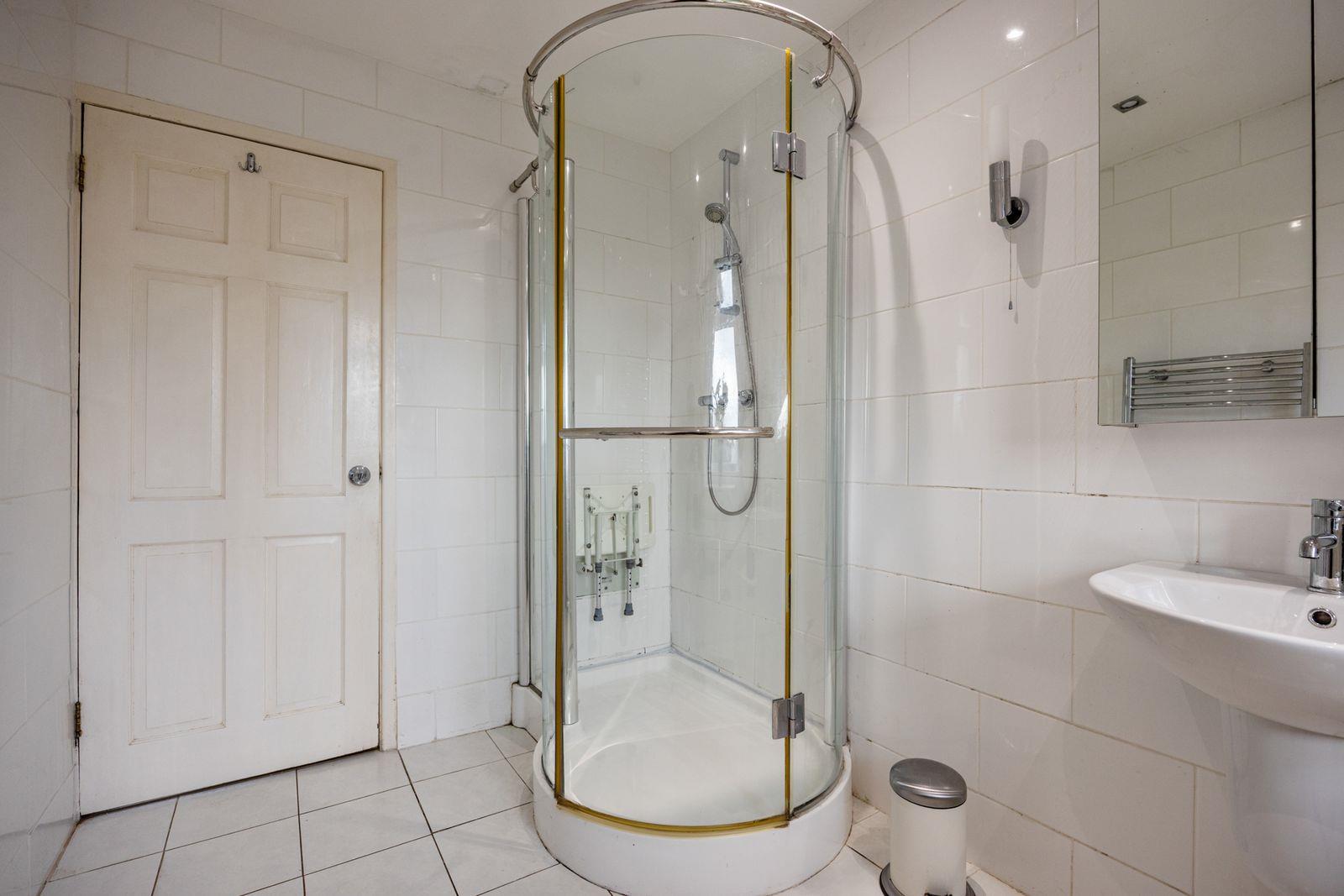 Comprising: Corner shower with Thermostatic shower over. Wash hand basin. W.C. Tiled walls. Ceramic tiled floor. 4 Downlights. Chrome heated towel rail.