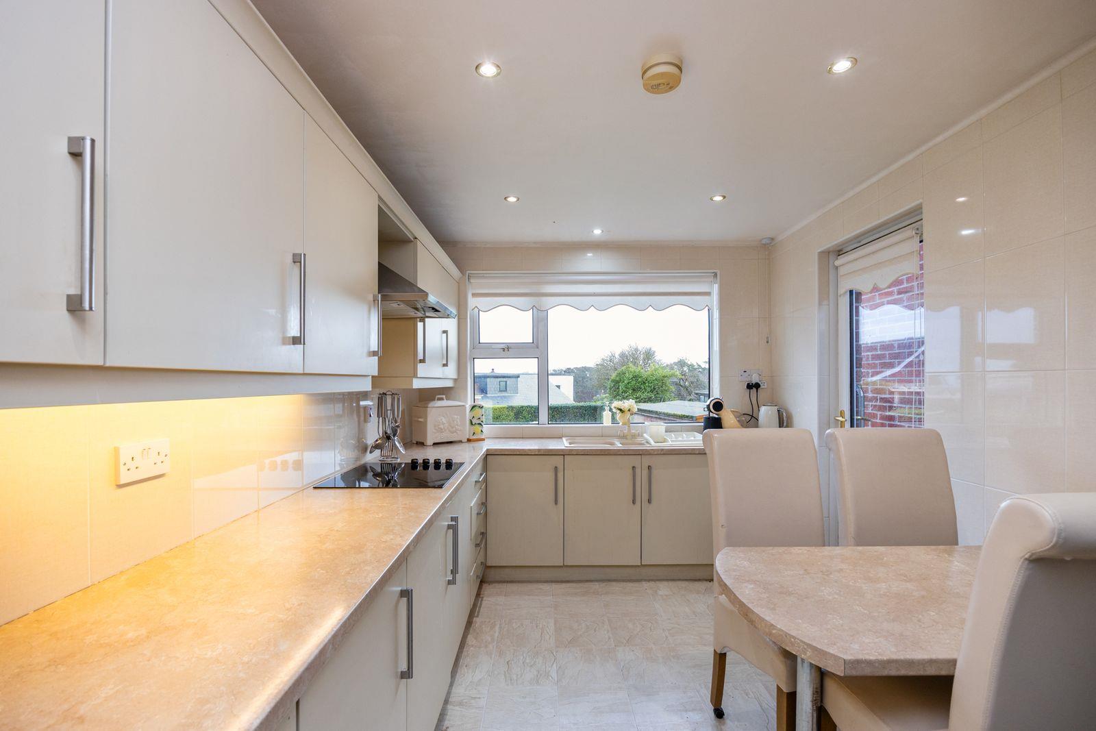 Range of champagne gloss high and low level cupboards and drawers with roll edge work surfaces. Built-in ceramic 4 ring hob and Beko double oven. Extractor hood with integrated fan and light. 11/2 tub single drainer sink unit with mixer taps. Plumbed for dishwasher. Tiled walls. Tiled effect laminated wood floor. 8 Downlights.