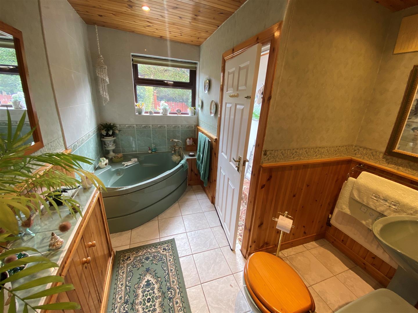 Coloured suite comprising corner panelled bath with mixer tap and telephone shower attachment. Pedestal wash hand basin. W.C. Part tiled walls. Part pine panelled walls. Ceramic tiled floor. Pine ceiling.
