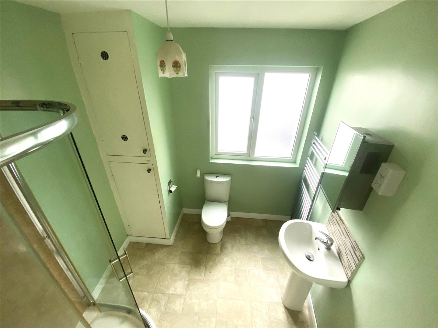 Low flush W.C. Pedestal wash hand basin with mixer tap and tiled splashback. Shower cubicle with panelled walls and shower. Wall mounted heated towel rail. Built-in hotpress with insulated copper cylinder and wall mounted gas boiler. White uPVC double glazed windows.