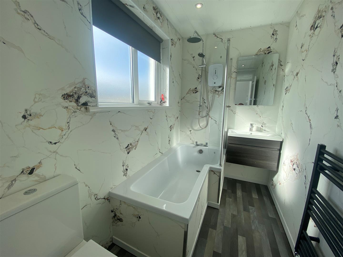 White suite comprising: Panelled bath with mixer taps and Triton electric shower with drencher. Vanity unit with wash hand basin. W.C. Panelled walls. PVC panelled ceiling with 4 downlights. Anthacrite heated towel rail.
