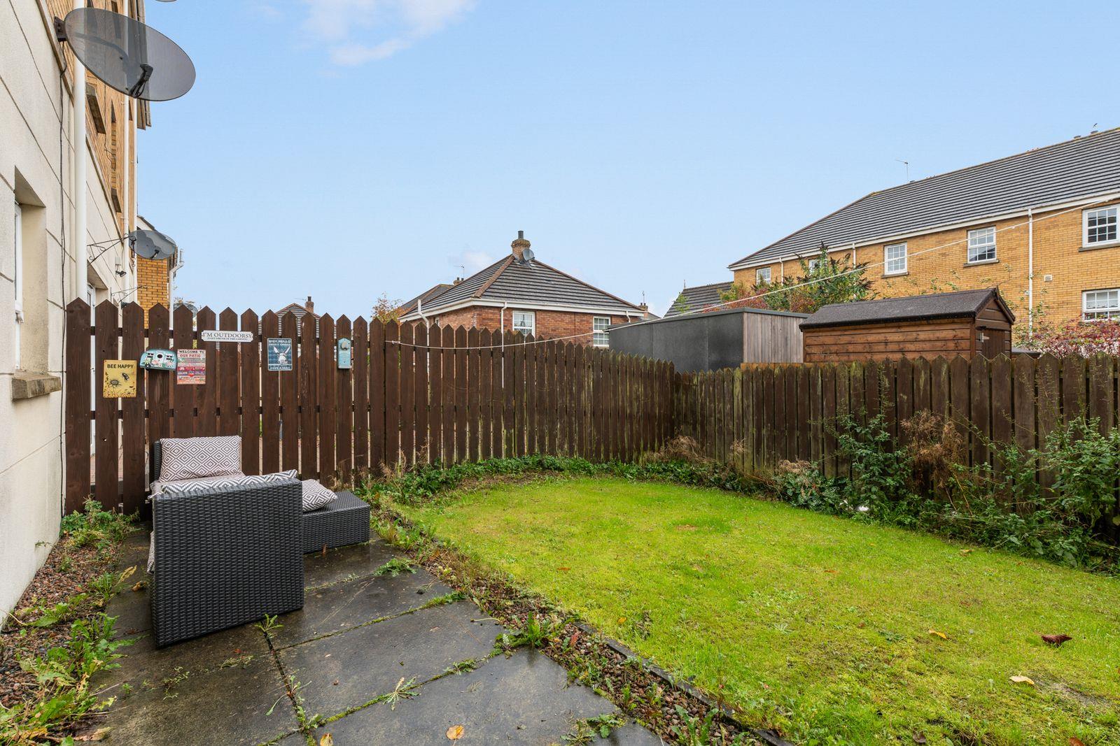 Paved path. Garden laid in lawn. Outside tap and light.