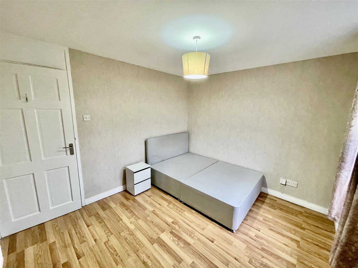 Double bedroom with wood laminate floor and built in storage.
