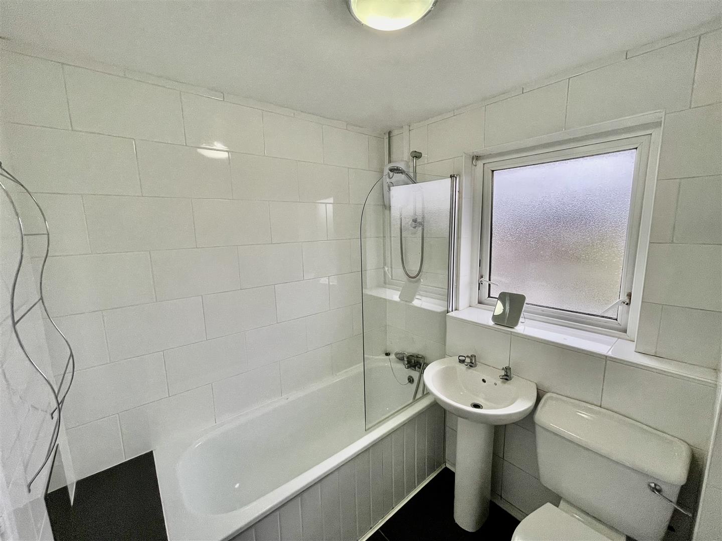 White suite comprising, panelled bath with mixer tap, wall mounted, overhead shower, glass shower screen, pedestal wash hand basin with mixer tap, low flush w/c, tiled walls.